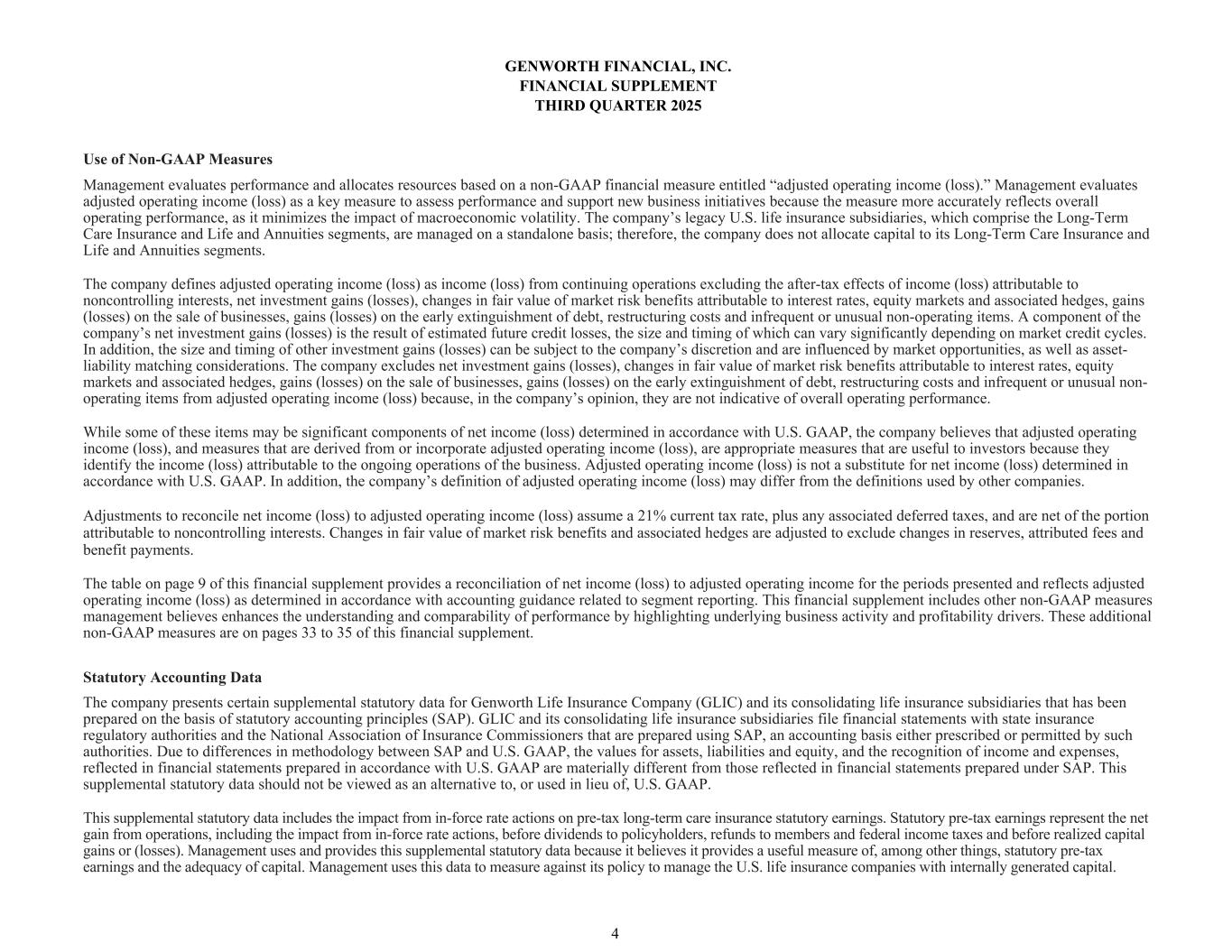 GENWORTH FINANCIAL, INC. FINANCIAL SUPPLEMENT THIRD QUARTER 2025 4 Use of Non-GAAP Measures Management evaluates performance and allocates resources based on a non-GAAP financial measure entitled “adjusted operating income (loss).” Management evaluates adjusted operating income (loss) as a key measure to assess performance and support new business initiatives because the measure more accurately reflects overall operating performance, as it minimizes the impact of macroeconomic volatility. The company’s legacy U.S. life insurance subsidiaries, which comprise the Long-Term Care Insurance and Life and Annuities segments, are managed on a standalone basis; therefore, the company does not allocate capital to its Long-Term Care Insurance and Life and Annuities segments. The company defines adjusted operating income (loss) as income (loss) from continuing operations excluding the after-tax effects of income (loss) attributable to noncontrolling interests, net investment gains (losses), changes in fair value of market risk benefits attributable to interest rates, equity markets and associated hedges, gains (losses) on the sale of businesses, gains (losses) on the early extinguishment of debt, restructuring costs and infrequent or unusual non-operating items. A component of the company’s net investment gains (losses) is the result of estimated future credit losses, the size and timing of which can vary significantly depending on market credit cycles. In addition, the size and timing of other investment gains (losses) can be subject to the company’s discretion and are influenced by market opportunities, as well as asset- liability matching considerations. The company excludes net investment gains (losses), changes in fair value of market risk benefits attributable to interest rates, equity markets and associated hedges, gains (losses) on the sale of businesses, gains (losses) on the early extinguishment of debt, restructuring costs and infrequent or unusual non- operating items from adjusted operating income (loss) because, in the company’s opinion, they are not indicative of overall operating performance. While some of these items may be significant components of net income (loss) determined in accordance with U.S. GAAP, the company believes that adjusted operating income (loss), and measures that are derived from or incorporate adjusted operating income (loss), are appropriate measures that are useful to investors because they identify the income (loss) attributable to the ongoing operations of the business. Adjusted operating income (loss) is not a substitute for net income (loss) determined in accordance with U.S. GAAP. In addition, the company’s definition of adjusted operating income (loss) may differ from the definitions used by other companies. Adjustments to reconcile net income (loss) to adjusted operating income (loss) assume a 21% current tax rate, plus any associated deferred taxes, and are net of the portion attributable to noncontrolling interests. Changes in fair value of market risk benefits and associated hedges are adjusted to exclude changes in reserves, attributed fees and benefit payments. The table on page 9 of this financial supplement provides a reconciliation of net income (loss) to adjusted operating income for the periods presented and reflects adjusted operating income (loss) as determined in accordance with accounting guidance related to segment reporting. This financial supplement includes other non-GAAP measures management believes enhances the understanding and comparability of performance by highlighting underlying business activity and profitability drivers. These additional non-GAAP measures are on pages 33 to 35 of this financial supplement. Statutory Accounting Data The company presents certain supplemental statutory data for Genworth Life Insurance Company (GLIC) and its consolidating life insurance subsidiaries that has been prepared on the basis of statutory accounting principles (SAP). GLIC and its consolidating life insurance subsidiaries file financial statements with state insurance regulatory authorities and the National Association of Insurance Commissioners that are prepared using SAP, an accounting basis either prescribed or permitted by such authorities. Due to differences in methodology between SAP and U.S. GAAP, the values for assets, liabilities and equity, and the recognition of income and expenses, reflected in financial statements prepared in accordance with U.S. GAAP are materially different from those reflected in financial statements prepared under SAP. This supplemental statutory data should not be viewed as an alternative to, or used in lieu of, U.S. GAAP. This supplemental statutory data includes the impact from in-force rate actions on pre-tax long-term care insurance statutory earnings. Statutory pre-tax earnings represent the net gain from operations, including the impact from in-force rate actions, before dividends to policyholders, refunds to members and federal income taxes and before realized capital gains or (losses). Management uses and provides this supplemental statutory data because it believes it provides a useful measure of, among other things, statutory pre-tax earnings and the adequacy of capital. Management uses this data to measure against its policy to manage the U.S. life insurance companies with internally generated capital.