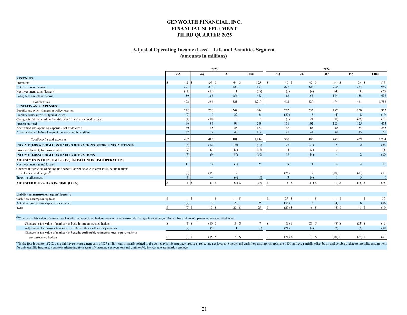 3Q 2Q 1Q Total 4Q 3Q 2Q 1Q Total $ 42 $ 39 $ 44 $ 125 $ 40 $ 42 $ 44 $ 53 $ 179 221 216 220 657 227 228 250 254 959 (11) (17) 1 (27) (8) (4) (4) (4) (20) 150 156 156 462 153 163 164 158 638 402 394 421 1,217 412 429 454 461 1,756 222 220 244 686 222 253 237 250 962 (7) 10 22 25 (29) 6 (4) 8 (19) (1) (10) 18 7 (3) 21 (8) (23) (13) 96 94 99 289 101 102 125 125 453 60 55 58 173 58 63 60 54 235 37 37 40 114 41 41 39 45 166 407 406 481 1,294 390 486 449 459 1,784 (5) (12) (60) (77) 22 (57) 5 2 (28) (2) (3) (13) (18) 4 (13) 1 — (8) (3) (9) (47) (59) 18 (44) 4 2 (20) 11 17 (1) 27 8 4 4 4 20 (3) (15) 19 1 (24) 17 (10) (26) (43) (1) — (4) (5) 3 (4) 1 5 5 $ 4 $ (7) $ (33) $ (36) $ 5 $ (27) $ (1) $ (15) $ (38) $ — $ — $ — $ — $ 27 $ — $ — $ — $ 27 (7) 10 22 25 (56) 6 (4) 8 (46) $ (7) $ 10 $ 22 $ 25 $ (29) $ 6 $ (4) $ 8 $ (19) $ (1) $ (10) $ 18 $ 7 $ (3) $ 21 $ (8) $ (23) $ (13) (2) (5) 1 (6) (21) (4) (2) (3) (30) $ (3) $ (15) $ 19 $ 1 $ (24) $ 17 $ (10) $ (26) $ (43) 2025 2024 Total revenues Policy fees and other income REVENUES: Premiums Net investment gains (losses) Net investment income BENEFITS AND EXPENSES: Benefits and other changes in policy reserves Changes in fair value of market risk benefits and associated hedges Liability remeasurement (gains) losses Acquisition and operating expenses, net of deferrals Interest credited Amortization of deferred acquisition costs and intangibles Provision (benefit) for income taxes INCOME (LOSS) FROM CONTINUING OPERATIONS BEFORE INCOME TAXES Total benefits and expenses ADJUSTMENTS TO INCOME (LOSS) FROM CONTINUING OPERATIONS: INCOME (LOSS) FROM CONTINUING OPERATIONS Net investment (gains) losses Changes in fair value of market risk benefits attributable to interest rates, equity markets Taxes on adjustments and associated hedges(1) ADJUSTED OPERATING INCOME (LOSS) Liability remeasurement (gains) losses(2): Cash flow assumption updates Total Actual variances from expected experience (2)In the fourth quarter of 2024, the liability remeasurement gain of $29 million was primarily related to the company’s life insurance products, reflecting net favorable model and cash flow assumption updates of $30 million, partially offset by an unfavorable update to mortality assumptions for universal life insurance contracts originating from term life insurance conversions and unfavorable interest rate assumption updates. (1)Changes in fair value of market risk benefits and associated hedges were adjusted to exclude changes in reserves, attributed fees and benefit payments as reconciled below: Changes in fair value of market risk benefits and associated hedges Adjustment for changes in reserves, attributed fees and benefit payments and associated hedges Changes in fair value of market risk benefits attributable to interest rates, equity markets GENWORTH FINANCIAL, INC. FINANCIAL SUPPLEMENT THIRD QUARTER 2025 Adjusted Operating Income (Loss)—Life and Annuities Segment (amounts in millions) 21