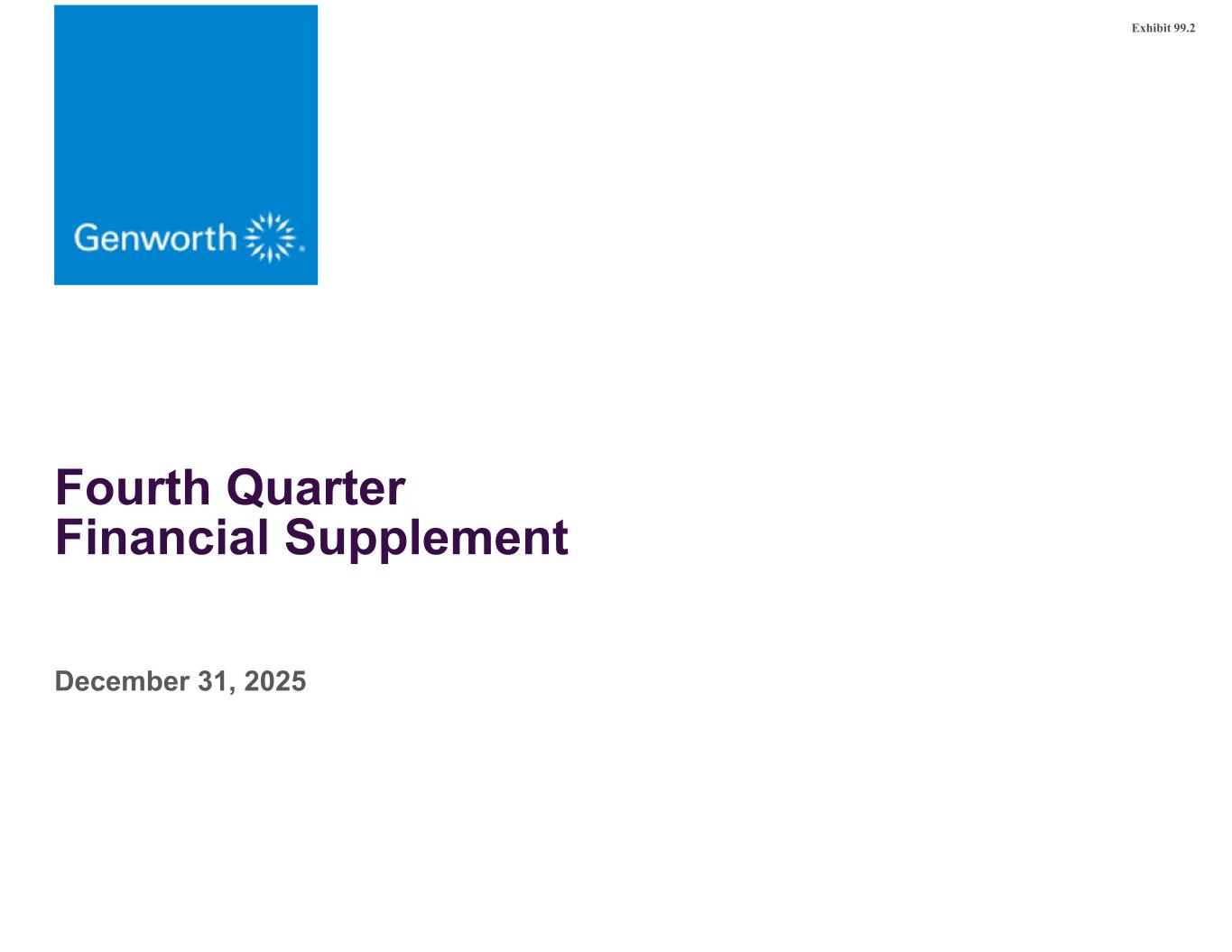 Dear Investor, Thank you for your continued interest in Genworth Financial, Inc. Please see the accompanying press release and summary presentation posted to the company’s website at https://investor.genworth.com for additional information regarding its fourth quarter 2025 earnings results. In October 2025, the company began selling an individual long-term care insurance product through its CareScout Insurance subsidiary, CareScout Insurance Company, and ceased sales of long-term care insurance products through Genworth Life Insurance Company (GLIC). In connection with the cessation of sales through GLIC, beginning in the fourth quarter of 2025, the company changed its reportable segments to better align with how it currently manages its business. Under the new reporting structure, the company operates its business through the following two reportable segments: Enact, comprised primarily of private mortgage insurance products, and Closed Block, comprised of long- term care insurance, life insurance and annuities products that were previously sold through GLIC and its subsidiaries (collectively referred to as the company’s legacy insurance subsidiaries). In addition to its two reportable segments, the company discloses other business activities and operating results in Corporate and Other, including its start-up businesses, CareScout Services and CareScout Insurance. The company believes the change helps to enhance understanding of business performance and better aligns with its strategic priorities, including to maintain self-sustaining legacy insurance subsidiaries, which are managed on a standalone basis. All prior period financial information has been recast to reflect the reorganized segment reporting structure. The company has added insurance in-force for its life insurance products on page 22 of this financial supplement. Investors are encouraged to listen to the company’s earnings call on the fourth quarter 2025 results at 9:00 a.m. (ET) on February 24, 2026. The company’s conference call will be accessible via telephone and internet. The dial-in number for Genworth’s February 24 conference call is 800-330-6710 or 213-279-1505 (outside the U.S.); conference ID #5373572. To participate in the call by webcast, register at least 15 minutes in advance at https://investor.genworth.com. Regards, Christine Jewell Investor Relations InvestorInfo@genworth.com GENWORTH FINANCIAL, INC. FINANCIAL SUPPLEMENT FOURTH QUARTER 2025 3