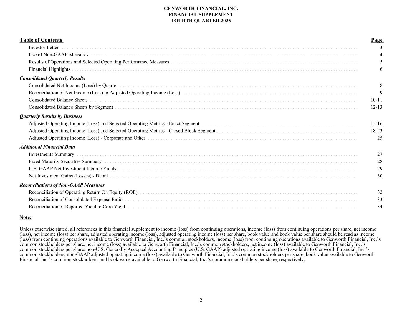 Table of Contents Page Investor Letter . . . . . . . . . . . . . . . . . . . . . . . . . . . . . . . . . . . . . . . . . . . . . . . . . . . . . . . . . . . . . . . . . . . . . . . . . . . . . . . . . . . . . . . . . . . . . . . . . . . . . . . . . . . . . . . . . . . . . 3 Use of Non-GAAP Measures . . . . . . . . . . . . . . . . . . . . . . . . . . . . . . . . . . . . . . . . . . . . . . . . . . . . . . . . . . . . . . . . . . . . . . . . . . . . . . . . . . . . . . . . . . . . . . . . . . . . . . . . . . 4 Results of Operations and Selected Operating Performance Measures . . . . . . . . . . . . . . . . . . . . . . . . . . . . . . . . . . . . . . . . . . . . . . . . . . . . . . . . . . . . . . . . . . . . . . . . . . 5 Financial Highlights . . . . . . . . . . . . . . . . . . . . . . . . . . . . . . . . . . . . . . . . . . . . . . . . . . . . . . . . . . . . . . . . . . . . . . . . . . . . . . . . . . . . . . . . . . . . . . . . . . . . . . . . . . . . . . . . . 6 Consolidated Quarterly Results Consolidated Net Income (Loss) by Quarter . . . . . . . . . . . . . . . . . . . . . . . . . . . . . . . . . . . . . . . . . . . . . . . . . . . . . . . . . . . . . . . . . . . . . . . . . . . . . . . . . . . . . . . . . . . . . . 8 Reconciliation of Net Income (Loss) to Adjusted Operating Income (Loss) . . . . . . . . . . . . . . . . . . . . . . . . . . . . . . . . . . . . . . . . . . . . . . . . . . . . . . . . . . . . . . . . . . . . . 9 Consolidated Balance Sheets . . . . . . . . . . . . . . . . . . . . . . . . . . . . . . . . . . . . . . . . . . . . . . . . . . . . . . . . . . . . . . . . . . . . . . . . . . . . . . . . . . . . . . . . . . . . . . . . . . . . . . . . . . 10-11 Consolidated Balance Sheets by Segment . . . . . . . . . . . . . . . . . . . . . . . . . . . . . . . . . . . . . . . . . . . . . . . . . . . . . . . . . . . . . . . . . . . . . . . . . . . . . . . . . . . . . . . . . . . . . . . . 12-13 Quarterly Results by Business Adjusted Operating Income (Loss) and Selected Operating Metrics - Enact Segment . . . . . . . . . . . . . . . . . . . . . . . . . . . . . . . . . . . . . . . . . . . . . . . . . . . . . . . . . . . . . . 15-16 Adjusted Operating Income (Loss) and Selected Operating Metrics - Closed Block Segment . . . . . . . . . . . . . . . . . . . . . . . . . . . . . . . . . . . . . . . . . . . . . . . . . . . . . . . . 18-23 Adjusted Operating Income (Loss) - Corporate and Other . . . . . . . . . . . . . . . . . . . . . . . . . . . . . . . . . . . . . . . . . . . . . . . . . . . . . . . . . . . . . . . . . . . . . . . . . . . . . . . . . . . 25 Additional Financial Data Investments Summary . . . . . . . . . . . . . . . . . . . . . . . . . . . . . . . . . . . . . . . . . . . . . . . . . . . . . . . . . . . . . . . . . . . . . . . . . . . . . . . . . . . . . . . . . . . . . . . . . . . . . . . . . . . . . . . 27 Fixed Maturity Securities Summary . . . . . . . . . . . . . . . . . . . . . . . . . . . . . . . . . . . . . . . . . . . . . . . . . . . . . . . . . . . . . . . . . . . . . . . . . . . . . . . . . . . . . . . . . . . . . . . . . . . . 28 U.S. GAAP Net Investment Income Yields . . . . . . . . . . . . . . . . . . . . . . . . . . . . . . . . . . . . . . . . . . . . . . . . . . . . . . . . . . . . . . . . . . . . . . . . . . . . . . . . . . . . . . . . . . . . . . . 29 Net Investment Gains (Losses) - Detail . . . . . . . . . . . . . . . . . . . . . . . . . . . . . . . . . . . . . . . . . . . . . . . . . . . . . . . . . . . . . . . . . . . . . . . . . . . . . . . . . . . . . . . . . . . . . . . . . . 30 Reconciliations of Non-GAAP Measures Reconciliation of Operating Return On Equity (ROE) . . . . . . . . . . . . . . . . . . . . . . . . . . . . . . . . . . . . . . . . . . . . . . . . . . . . . . . . . . . . . . . . . . . . . . . . . . . . . . . . . . . . . . 32 Reconciliation of Consolidated Expense Ratio . . . . . . . . . . . . . . . . . . . . . . . . . . . . . . . . . . . . . . . . . . . . . . . . . . . . . . . . . . . . . . . . . . . . . . . . . . . . . . . . . . . . . . . . . . . . 33 Reconciliation of Reported Yield to Core Yield . . . . . . . . . . . . . . . . . . . . . . . . . . . . . . . . . . . . . . . . . . . . . . . . . . . . . . . . . . . . . . . . . . . . . . . . . . . . . . . . . . . . . . . . . . . 34 Note: Unless otherwise stated, all references in this financial supplement to income (loss) from continuing operations, income (loss) from continuing operations per share, net income (loss), net income (loss) per share, adjusted operating income (loss), adjusted operating income (loss) per share, book value and book value per share should be read as income (loss) from continuing operations available to Genworth Financial, Inc.’s common stockholders, income (loss) from continuing operations available to Genworth Financial, Inc.’s common stockholders per share, net income (loss) available to Genworth Financial, Inc.’s common stockholders, net income (loss) available to Genworth Financial, Inc.’s common stockholders per share, non-U.S. Generally Accepted Accounting Principles (U.S. GAAP) adjusted operating income (loss) available to Genworth Financial, Inc.’s common stockholders, non-GAAP adjusted operating income (loss) available to Genworth Financial, Inc.’s common stockholders per share, book value available to Genworth Financial, Inc.’s common stockholders and book value available to Genworth Financial, Inc.’s common stockholders per share, respectively. GENWORTH FINANCIAL, INC. FINANCIAL SUPPLEMENT FOURTH QUARTER 2025 2