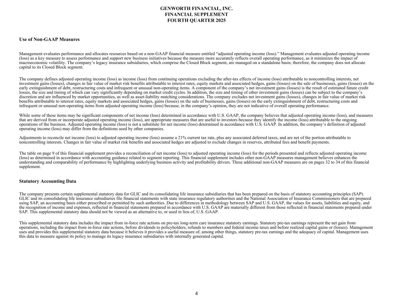 Use of Non-GAAP Measures Management evaluates performance and allocates resources based on a non-GAAP financial measure entitled “adjusted operating income (loss).” Management evaluates adjusted operating income (loss) as a key measure to assess performance and support new business initiatives because the measure more accurately reflects overall operating performance, as it minimizes the impact of macroeconomic volatility. The company’s legacy insurance subsidiaries, which comprise the Closed Block segment, are managed on a standalone basis; therefore, the company does not allocate capital to its Closed Block segment. The company defines adjusted operating income (loss) as income (loss) from continuing operations excluding the after-tax effects of income (loss) attributable to noncontrolling interests, net investment gains (losses), changes in fair value of market risk benefits attributable to interest rates, equity markets and associated hedges, gains (losses) on the sale of businesses, gains (losses) on the early extinguishment of debt, restructuring costs and infrequent or unusual non-operating items. A component of the company’s net investment gains (losses) is the result of estimated future credit losses, the size and timing of which can vary significantly depending on market credit cycles. In addition, the size and timing of other investment gains (losses) can be subject to the company’s discretion and are influenced by market opportunities, as well as asset-liability matching considerations. The company excludes net investment gains (losses), changes in fair value of market risk benefits attributable to interest rates, equity markets and associated hedges, gains (losses) on the sale of businesses, gains (losses) on the early extinguishment of debt, restructuring costs and infrequent or unusual non-operating items from adjusted operating income (loss) because, in the company’s opinion, they are not indicative of overall operating performance. While some of these items may be significant components of net income (loss) determined in accordance with U.S. GAAP, the company believes that adjusted operating income (loss), and measures that are derived from or incorporate adjusted operating income (loss), are appropriate measures that are useful to investors because they identify the income (loss) attributable to the ongoing operations of the business. Adjusted operating income (loss) is not a substitute for net income (loss) determined in accordance with U.S. GAAP. In addition, the company’s definition of adjusted operating income (loss) may differ from the definitions used by other companies. Adjustments to reconcile net income (loss) to adjusted operating income (loss) assume a 21% current tax rate, plus any associated deferred taxes, and are net of the portion attributable to noncontrolling interests. Changes in fair value of market risk benefits and associated hedges are adjusted to exclude changes in reserves, attributed fees and benefit payments. The table on page 9 of this financial supplement provides a reconciliation of net income (loss) to adjusted operating income (loss) for the periods presented and reflects adjusted operating income (loss) as determined in accordance with accounting guidance related to segment reporting. This financial supplement includes other non-GAAP measures management believes enhances the understanding and comparability of performance by highlighting underlying business activity and profitability drivers. These additional non-GAAP measures are on pages 32 to 34 of this financial supplement. Statutory Accounting Data The company presents certain supplemental statutory data for GLIC and its consolidating life insurance subsidiaries that has been prepared on the basis of statutory accounting principles (SAP). GLIC and its consolidating life insurance subsidiaries file financial statements with state insurance regulatory authorities and the National Association of Insurance Commissioners that are prepared using SAP, an accounting basis either prescribed or permitted by such authorities. Due to differences in methodology between SAP and U.S. GAAP, the values for assets, liabilities and equity, and the recognition of income and expenses, reflected in financial statements prepared in accordance with U.S. GAAP are materially different from those reflected in financial statements prepared under SAP. This supplemental statutory data should not be viewed as an alternative to, or used in lieu of, U.S. GAAP. This supplemental statutory data includes the impact from in-force rate actions on pre-tax long-term care insurance statutory earnings. Statutory pre-tax earnings represent the net gain from operations, including the impact from in-force rate actions, before dividends to policyholders, refunds to members and federal income taxes and before realized capital gains or (losses). Management uses and provides this supplemental statutory data because it believes it provides a useful measure of, among other things, statutory pre-tax earnings and the adequacy of capital. Management uses this data to measure against its policy to manage its legacy insurance subsidiaries with internally generated capital. GENWORTH FINANCIAL, INC. FINANCIAL SUPPLEMENT FOURTH QUARTER 2025 4