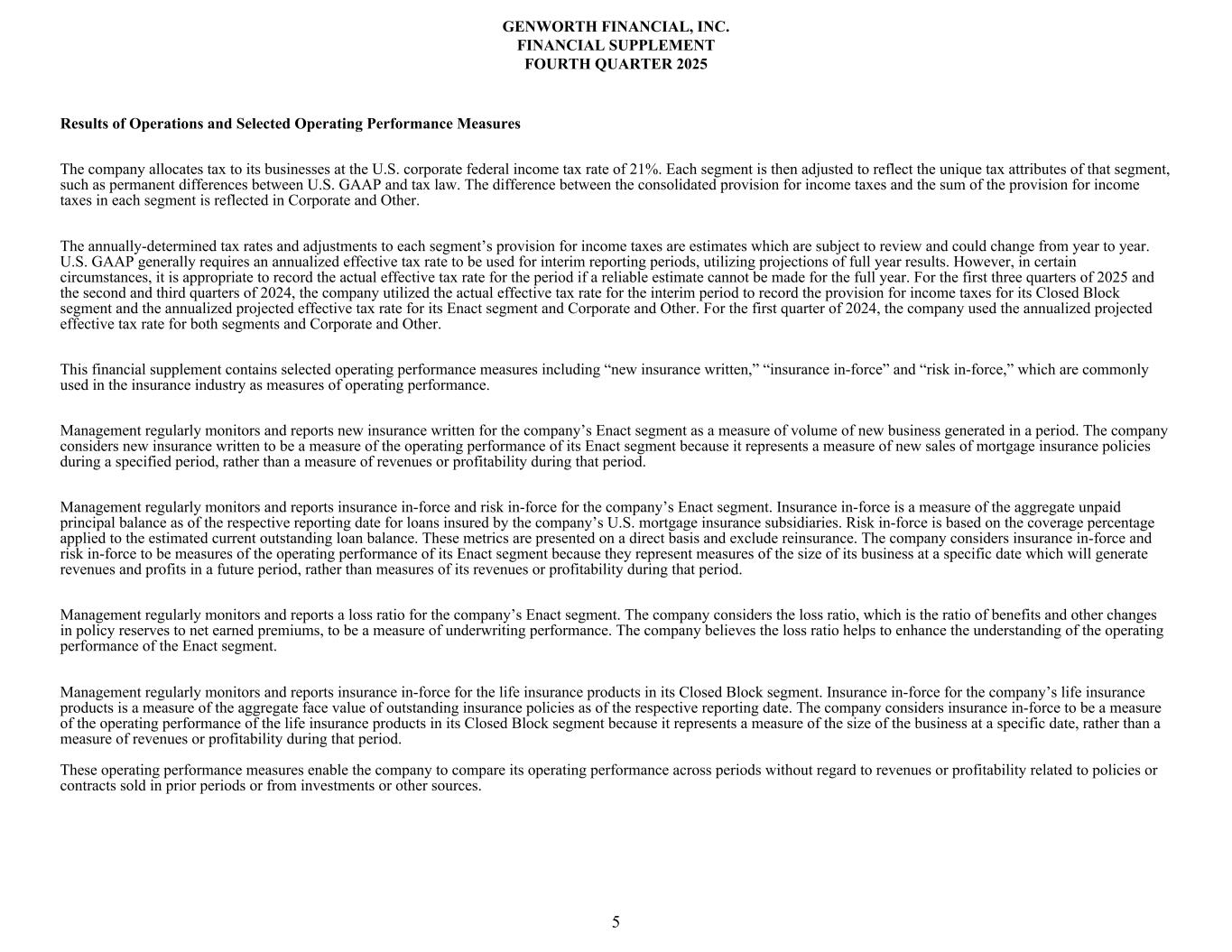 Results of Operations and Selected Operating Performance Measures The company allocates tax to its businesses at the U.S. corporate federal income tax rate of 21%. Each segment is then adjusted to reflect the unique tax attributes of that segment, such as permanent differences between U.S. GAAP and tax law. The difference between the consolidated provision for income taxes and the sum of the provision for income taxes in each segment is reflected in Corporate and Other. The annually-determined tax rates and adjustments to each segment’s provision for income taxes are estimates which are subject to review and could change from year to year. U.S. GAAP generally requires an annualized effective tax rate to be used for interim reporting periods, utilizing projections of full year results. However, in certain circumstances, it is appropriate to record the actual effective tax rate for the period if a reliable estimate cannot be made for the full year. For the first three quarters of 2025 and the second and third quarters of 2024, the company utilized the actual effective tax rate for the interim period to record the provision for income taxes for its Closed Block segment and the annualized projected effective tax rate for its Enact segment and Corporate and Other. For the first quarter of 2024, the company used the annualized projected effective tax rate for both segments and Corporate and Other. This financial supplement contains selected operating performance measures including “new insurance written,” “insurance in-force” and “risk in-force,” which are commonly used in the insurance industry as measures of operating performance. Management regularly monitors and reports new insurance written for the company’s Enact segment as a measure of volume of new business generated in a period. The company considers new insurance written to be a measure of the operating performance of its Enact segment because it represents a measure of new sales of mortgage insurance policies during a specified period, rather than a measure of revenues or profitability during that period. Management regularly monitors and reports insurance in-force and risk in-force for the company’s Enact segment. Insurance in-force is a measure of the aggregate unpaid principal balance as of the respective reporting date for loans insured by the company’s U.S. mortgage insurance subsidiaries. Risk in-force is based on the coverage percentage applied to the estimated current outstanding loan balance. These metrics are presented on a direct basis and exclude reinsurance. The company considers insurance in-force and risk in-force to be measures of the operating performance of its Enact segment because they represent measures of the size of its business at a specific date which will generate revenues and profits in a future period, rather than measures of its revenues or profitability during that period. Management regularly monitors and reports a loss ratio for the company’s Enact segment. The company considers the loss ratio, which is the ratio of benefits and other changes in policy reserves to net earned premiums, to be a measure of underwriting performance. The company believes the loss ratio helps to enhance the understanding of the operating performance of the Enact segment. Management regularly monitors and reports insurance in-force for the life insurance products in its Closed Block segment. Insurance in-force for the company’s life insurance products is a measure of the aggregate face value of outstanding insurance policies as of the respective reporting date. The company considers insurance in-force to be a measure of the operating performance of the life insurance products in its Closed Block segment because it represents a measure of the size of the business at a specific date, rather than a measure of revenues or profitability during that period. These operating performance measures enable the company to compare its operating performance across periods without regard to revenues or profitability related to policies or contracts sold in prior periods or from investments or other sources. GENWORTH FINANCIAL, INC. FINANCIAL SUPPLEMENT FOURTH QUARTER 2025 5