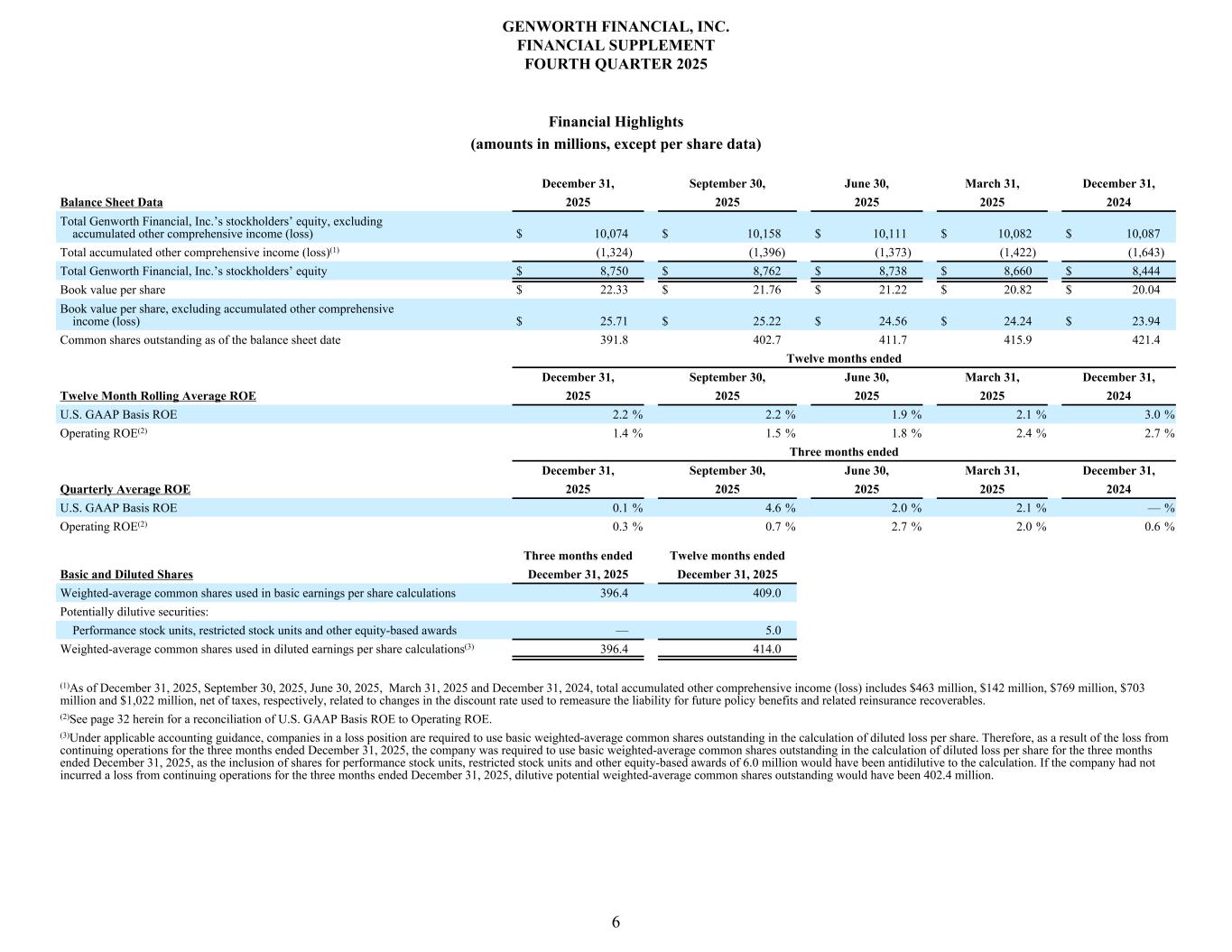 Financial Highlights (amounts in millions, except per share data) December 31, September 30, June 30, March 31, December 31, Balance Sheet Data 2025 2025 2025 2025 2024 Total Genworth Financial, Inc.’s stockholders’ equity, excluding accumulated other comprehensive income (loss) $ 10,074 $ 10,158 $ 10,111 $ 10,082 $ 10,087 Total accumulated other comprehensive income (loss)(1) (1,324) (1,396) (1,373) (1,422) (1,643) Total Genworth Financial, Inc.’s stockholders’ equity $ 8,750 $ 8,762 $ 8,738 $ 8,660 $ 8,444 Book value per share $ 22.33 $ 21.76 $ 21.22 $ 20.82 $ 20.04 Book value per share, excluding accumulated other comprehensive income (loss) $ 25.71 $ 25.22 $ 24.56 $ 24.24 $ 23.94 Common shares outstanding as of the balance sheet date 391.8 402.7 411.7 415.9 421.4 Twelve months ended December 31, September 30, June 30, March 31, December 31, Twelve Month Rolling Average ROE 2025 2025 2025 2025 2024 U.S. GAAP Basis ROE 2.2 % 2.2 % 1.9 % 2.1 % 3.0 % Operating ROE(2) 1.4 % 1.5 % 1.8 % 2.4 % 2.7 % Three months ended December 31, September 30, June 30, March 31, December 31, Quarterly Average ROE 2025 2025 2025 2025 2024 U.S. GAAP Basis ROE 0.1 % 4.6 % 2.0 % 2.1 % — % Operating ROE(2) 0.3 % 0.7 % 2.7 % 2.0 % 0.6 % Three months ended Twelve months ended Basic and Diluted Shares December 31, 2025 December 31, 2025 Weighted-average common shares used in basic earnings per share calculations 396.4 409.0 Potentially dilutive securities: Performance stock units, restricted stock units and other equity-based awards — 5.0 Weighted-average common shares used in diluted earnings per share calculations(3) 396.4 414.0 (1)As of December 31, 2025, September 30, 2025, June 30, 2025, March 31, 2025 and December 31, 2024, total accumulated other comprehensive income (loss) includes $463 million, $142 million, $769 million, $703 million and $1,022 million, net of taxes, respectively, related to changes in the discount rate used to remeasure the liability for future policy benefits and related reinsurance recoverables. (2)See page 32 herein for a reconciliation of U.S. GAAP Basis ROE to Operating ROE. (3)Under applicable accounting guidance, companies in a loss position are required to use basic weighted-average common shares outstanding in the calculation of diluted loss per share. Therefore, as a result of the loss from continuing operations for the three months ended December 31, 2025, the company was required to use basic weighted-average common shares outstanding in the calculation of diluted loss per share for the three months ended December 31, 2025, as the inclusion of shares for performance stock units, restricted stock units and other equity-based awards of 6.0 million would have been antidilutive to the calculation. If the company had not incurred a loss from continuing operations for the three months ended December 31, 2025, dilutive potential weighted-average common shares outstanding would have been 402.4 million. GENWORTH FINANCIAL, INC. FINANCIAL SUPPLEMENT FOURTH QUARTER 2025 6