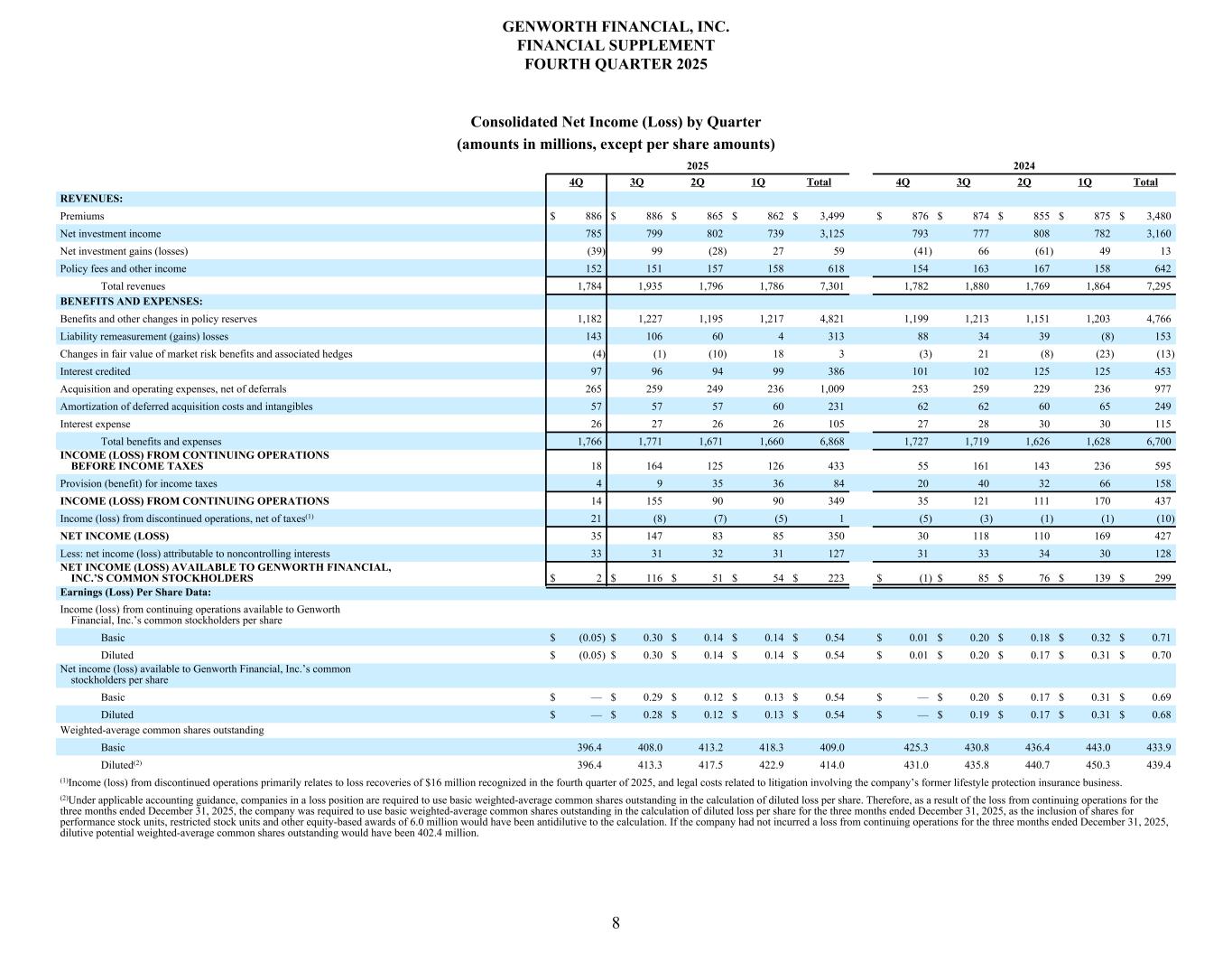 Consolidated Net Income (Loss) by Quarter (amounts in millions, except per share amounts) 2025 2024 4Q 3Q 2Q 1Q Total 4Q 3Q 2Q 1Q Total REVENUES: Premiums $ 886 $ 886 $ 865 $ 862 $ 3,499 $ 876 $ 874 $ 855 $ 875 $ 3,480 Net investment income 785 799 802 739 3,125 793 777 808 782 3,160 Net investment gains (losses) (39) 99 (28) 27 59 (41) 66 (61) 49 13 Policy fees and other income 152 151 157 158 618 154 163 167 158 642 Total revenues 1,784 1,935 1,796 1,786 7,301 1,782 1,880 1,769 1,864 7,295 BENEFITS AND EXPENSES: Benefits and other changes in policy reserves 1,182 1,227 1,195 1,217 4,821 1,199 1,213 1,151 1,203 4,766 Liability remeasurement (gains) losses 143 106 60 4 313 88 34 39 (8) 153 Changes in fair value of market risk benefits and associated hedges (4) (1) (10) 18 3 (3) 21 (8) (23) (13) Interest credited 97 96 94 99 386 101 102 125 125 453 Acquisition and operating expenses, net of deferrals 265 259 249 236 1,009 253 259 229 236 977 Amortization of deferred acquisition costs and intangibles 57 57 57 60 231 62 62 60 65 249 Interest expense 26 27 26 26 105 27 28 30 30 115 Total benefits and expenses 1,766 1,771 1,671 1,660 6,868 1,727 1,719 1,626 1,628 6,700 INCOME (LOSS) FROM CONTINUING OPERATIONS BEFORE INCOME TAXES 18 164 125 126 433 55 161 143 236 595 Provision (benefit) for income taxes 4 9 35 36 84 20 40 32 66 158 INCOME (LOSS) FROM CONTINUING OPERATIONS 14 155 90 90 349 35 121 111 170 437 Income (loss) from discontinued operations, net of taxes(1) 21 (8) (7) (5) 1 (5) (3) (1) (1) (10) NET INCOME (LOSS) 35 147 83 85 350 30 118 110 169 427 Less: net income (loss) attributable to noncontrolling interests 33 31 32 31 127 31 33 34 30 128 NET INCOME (LOSS) AVAILABLE TO GENWORTH FINANCIAL, INC.’S COMMON STOCKHOLDERS $ 2 $ 116 $ 51 $ 54 $ 223 $ (1) $ 85 $ 76 $ 139 $ 299 Earnings (Loss) Per Share Data: Income (loss) from continuing operations available to Genworth Financial, Inc.’s common stockholders per share Basic $ (0.05) $ 0.30 $ 0.14 $ 0.14 $ 0.54 $ 0.01 $ 0.20 $ 0.18 $ 0.32 $ 0.71 Diluted $ (0.05) $ 0.30 $ 0.14 $ 0.14 $ 0.54 $ 0.01 $ 0.20 $ 0.17 $ 0.31 $ 0.70 Net income (loss) available to Genworth Financial, Inc.’s common stockholders per share Basic $ — $ 0.29 $ 0.12 $ 0.13 $ 0.54 $ — $ 0.20 $ 0.17 $ 0.31 $ 0.69 Diluted $ — $ 0.28 $ 0.12 $ 0.13 $ 0.54 $ — $ 0.19 $ 0.17 $ 0.31 $ 0.68 Weighted-average common shares outstanding Basic 396.4 408.0 413.2 418.3 409.0 425.3 430.8 436.4 443.0 433.9 Diluted(2) 396.4 413.3 417.5 422.9 414.0 431.0 435.8 440.7 450.3 439.4 (1)Income (loss) from discontinued operations primarily relates to loss recoveries of $16 million recognized in the fourth quarter of 2025, and legal costs related to litigation involving the company’s former lifestyle protection insurance business. (2)Under applicable accounting guidance, companies in a loss position are required to use basic weighted-average common shares outstanding in the calculation of diluted loss per share. Therefore, as a result of the loss from continuing operations for the three months ended December 31, 2025, the company was required to use basic weighted-average common shares outstanding in the calculation of diluted loss per share for the three months ended December 31, 2025, as the inclusion of shares for performance stock units, restricted stock units and other equity-based awards of 6.0 million would have been antidilutive to the calculation. If the company had not incurred a loss from continuing operations for the three months ended December 31, 2025, dilutive potential weighted-average common shares outstanding would have been 402.4 million. GENWORTH FINANCIAL, INC. FINANCIAL SUPPLEMENT FOURTH QUARTER 2025 8