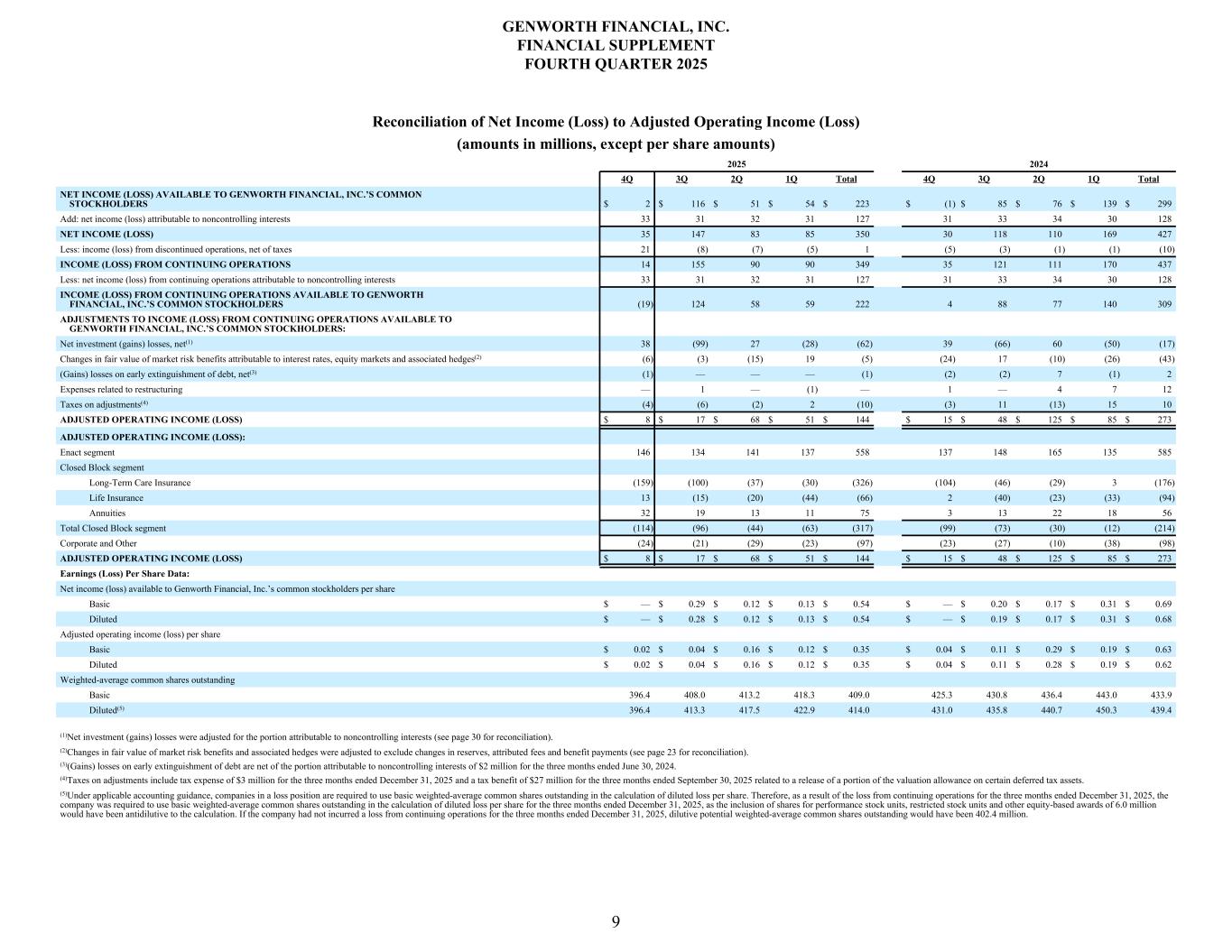 Reconciliation of Net Income (Loss) to Adjusted Operating Income (Loss) (amounts in millions, except per share amounts) 2025 2024 4Q 3Q 2Q 1Q Total 4Q 3Q 2Q 1Q Total NET INCOME (LOSS) AVAILABLE TO GENWORTH FINANCIAL, INC.’S COMMON STOCKHOLDERS $ 2 $ 116 $ 51 $ 54 $ 223 $ (1) $ 85 $ 76 $ 139 $ 299 Add: net income (loss) attributable to noncontrolling interests 33 31 32 31 127 31 33 34 30 128 NET INCOME (LOSS) 35 147 83 85 350 30 118 110 169 427 Less: income (loss) from discontinued operations, net of taxes 21 (8) (7) (5) 1 (5) (3) (1) (1) (10) INCOME (LOSS) FROM CONTINUING OPERATIONS 14 155 90 90 349 35 121 111 170 437 Less: net income (loss) from continuing operations attributable to noncontrolling interests 33 31 32 31 127 31 33 34 30 128 INCOME (LOSS) FROM CONTINUING OPERATIONS AVAILABLE TO GENWORTH FINANCIAL, INC.’S COMMON STOCKHOLDERS (19) 124 58 59 222 4 88 77 140 309 ADJUSTMENTS TO INCOME (LOSS) FROM CONTINUING OPERATIONS AVAILABLE TO GENWORTH FINANCIAL, INC.’S COMMON STOCKHOLDERS: Net investment (gains) losses, net(1) 38 (99) 27 (28) (62) 39 (66) 60 (50) (17) Changes in fair value of market risk benefits attributable to interest rates, equity markets and associated hedges(2) (6) (3) (15) 19 (5) (24) 17 (10) (26) (43) (Gains) losses on early extinguishment of debt, net(3) (1) — — — (1) (2) (2) 7 (1) 2 Expenses related to restructuring — 1 — (1) — 1 — 4 7 12 Taxes on adjustments(4) (4) (6) (2) 2 (10) (3) 11 (13) 15 10 ADJUSTED OPERATING INCOME (LOSS) $ 8 $ 17 $ 68 $ 51 $ 144 $ 15 $ 48 $ 125 $ 85 $ 273 ADJUSTED OPERATING INCOME (LOSS): Enact segment 146 134 141 137 558 137 148 165 135 585 Closed Block segment Long-Term Care Insurance (159) (100) (37) (30) (326) (104) (46) (29) 3 (176) Life Insurance 13 (15) (20) (44) (66) 2 (40) (23) (33) (94) Annuities 32 19 13 11 75 3 13 22 18 56 Total Closed Block segment (114) (96) (44) (63) (317) (99) (73) (30) (12) (214) Corporate and Other (24) (21) (29) (23) (97) (23) (27) (10) (38) (98) ADJUSTED OPERATING INCOME (LOSS) $ 8 $ 17 $ 68 $ 51 $ 144 $ 15 $ 48 $ 125 $ 85 $ 273 Earnings (Loss) Per Share Data: Net income (loss) available to Genworth Financial, Inc.’s common stockholders per share Basic $ — $ 0.29 $ 0.12 $ 0.13 $ 0.54 $ — $ 0.20 $ 0.17 $ 0.31 $ 0.69 Diluted $ — $ 0.28 $ 0.12 $ 0.13 $ 0.54 $ — $ 0.19 $ 0.17 $ 0.31 $ 0.68 Adjusted operating income (loss) per share Basic $ 0.02 $ 0.04 $ 0.16 $ 0.12 $ 0.35 $ 0.04 $ 0.11 $ 0.29 $ 0.19 $ 0.63 Diluted $ 0.02 $ 0.04 $ 0.16 $ 0.12 $ 0.35 $ 0.04 $ 0.11 $ 0.28 $ 0.19 $ 0.62 Weighted-average common shares outstanding Basic 396.4 408.0 413.2 418.3 409.0 425.3 430.8 436.4 443.0 433.9 Diluted(5) 396.4 413.3 417.5 422.9 414.0 431.0 435.8 440.7 450.3 439.4 (1)Net investment (gains) losses were adjusted for the portion attributable to noncontrolling interests (see page 30 for reconciliation). (2)Changes in fair value of market risk benefits and associated hedges were adjusted to exclude changes in reserves, attributed fees and benefit payments (see page 23 for reconciliation). (3)(Gains) losses on early extinguishment of debt are net of the portion attributable to noncontrolling interests of $2 million for the three months ended June 30, 2024. (4)Taxes on adjustments include tax expense of $3 million for the three months ended December 31, 2025 and a tax benefit of $27 million for the three months ended September 30, 2025 related to a release of a portion of the valuation allowance on certain deferred tax assets. (5)Under applicable accounting guidance, companies in a loss position are required to use basic weighted-average common shares outstanding in the calculation of diluted loss per share. Therefore, as a result of the loss from continuing operations for the three months ended December 31, 2025, the company was required to use basic weighted-average common shares outstanding in the calculation of diluted loss per share for the three months ended December 31, 2025, as the inclusion of shares for performance stock units, restricted stock units and other equity-based awards of 6.0 million would have been antidilutive to the calculation. If the company had not incurred a loss from continuing operations for the three months ended December 31, 2025, dilutive potential weighted-average common shares outstanding would have been 402.4 million. GENWORTH FINANCIAL, INC. FINANCIAL SUPPLEMENT FOURTH QUARTER 2025 9
