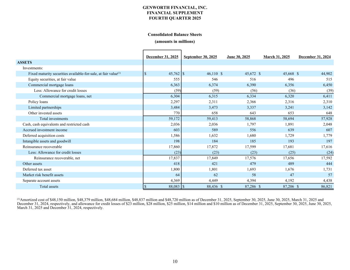 Consolidated Balance Sheets (amounts in millions) December 31, 2025 September 30, 2025 June 30, 2025 March 31, 2025 December 31, 2024 ASSETS Investments: Fixed maturity securities available-for-sale, at fair value(1) $ 45,762 $ 46,110 $ 45,672 $ 45,668 $ 44,902 Equity securities, at fair value 555 546 516 496 515 Commercial mortgage loans 6,363 6,374 6,390 6,356 6,450 Less: Allowance for credit losses (59) (59) (56) (36) (39) Commercial mortgage loans, net 6,304 6,315 6,334 6,320 6,411 Policy loans 2,297 2,311 2,366 2,316 2,310 Limited partnerships 3,484 3,473 3,337 3,241 3,142 Other invested assets 770 658 643 653 648 Total investments 59,172 59,413 58,868 58,694 57,928 Cash, cash equivalents and restricted cash 2,036 2,036 1,797 1,891 2,048 Accrued investment income 603 589 556 639 607 Deferred acquisition costs 1,586 1,632 1,680 1,729 1,779 Intangible assets and goodwill 198 184 185 193 197 Reinsurance recoverable 17,860 17,872 17,599 17,681 17,616 Less: Allowance for credit losses (23) (23) (23) (25) (24) Reinsurance recoverable, net 17,837 17,849 17,576 17,656 17,592 Other assets 418 421 479 489 444 Deferred tax asset 1,800 1,801 1,693 1,676 1,731 Market risk benefit assets 64 62 58 47 57 Separate account assets 4,369 4,449 4,394 4,192 4,438 Total assets $ 88,083 $ 88,436 $ 87,286 $ 87,206 $ 86,821 (1)Amortized cost of $48,150 million, $48,379 million, $48,684 million, $48,837 million and $48,720 million as of December 31, 2025, September 30, 2025, June 30, 2025, March 31, 2025 and December 31, 2024, respectively, and allowance for credit losses of $23 million, $28 million, $25 million, $14 million and $10 million as of December 31, 2025, September 30, 2025, June 30, 2025, March 31, 2025 and December 31, 2024, respectively. GENWORTH FINANCIAL, INC. FINANCIAL SUPPLEMENT FOURTH QUARTER 2025 10