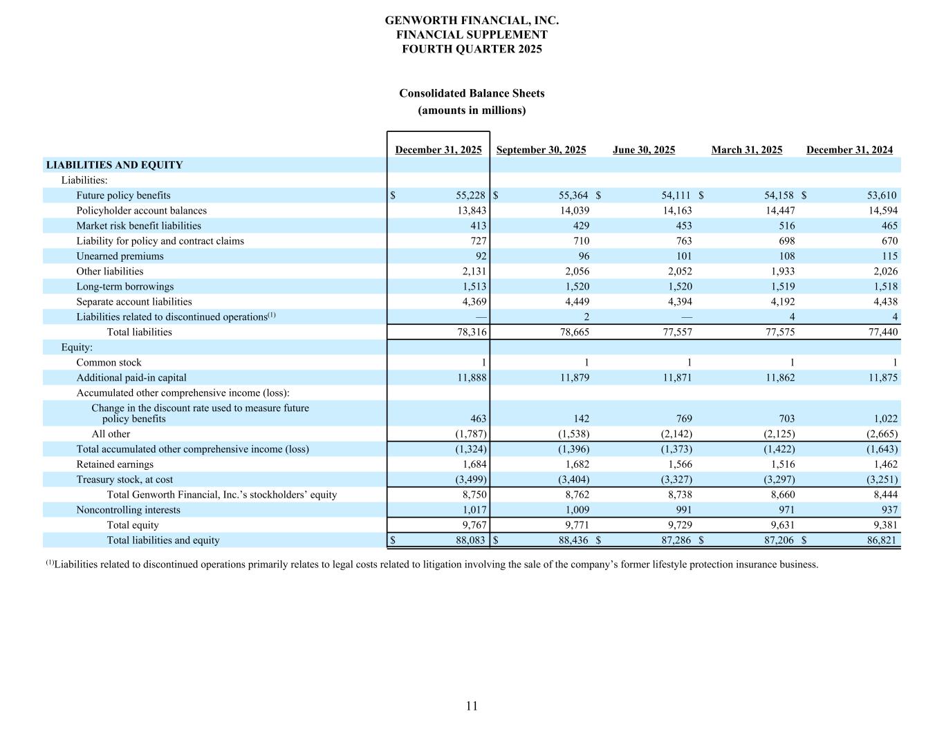 Consolidated Balance Sheets (amounts in millions) December 31, 2025 September 30, 2025 June 30, 2025 March 31, 2025 December 31, 2024 LIABILITIES AND EQUITY Liabilities: Future policy benefits $ 55,228 $ 55,364 $ 54,111 $ 54,158 $ 53,610 Policyholder account balances 13,843 14,039 14,163 14,447 14,594 Market risk benefit liabilities 413 429 453 516 465 Liability for policy and contract claims 727 710 763 698 670 Unearned premiums 92 96 101 108 115 Other liabilities 2,131 2,056 2,052 1,933 2,026 Long-term borrowings 1,513 1,520 1,520 1,519 1,518 Separate account liabilities 4,369 4,449 4,394 4,192 4,438 Liabilities related to discontinued operations(1) — 2 — 4 4 Total liabilities 78,316 78,665 77,557 77,575 77,440 Equity: Common stock 1 1 1 1 1 Additional paid-in capital 11,888 11,879 11,871 11,862 11,875 Accumulated other comprehensive income (loss): Change in the discount rate used to measure future policy benefits 463 142 769 703 1,022 All other (1,787) (1,538) (2,142) (2,125) (2,665) Total accumulated other comprehensive income (loss) (1,324) (1,396) (1,373) (1,422) (1,643) Retained earnings 1,684 1,682 1,566 1,516 1,462 Treasury stock, at cost (3,499) (3,404) (3,327) (3,297) (3,251) Total Genworth Financial, Inc.’s stockholders’ equity 8,750 8,762 8,738 8,660 8,444 Noncontrolling interests 1,017 1,009 991 971 937 Total equity 9,767 9,771 9,729 9,631 9,381 Total liabilities and equity $ 88,083 $ 88,436 $ 87,286 $ 87,206 $ 86,821 (1)Liabilities related to discontinued operations primarily relates to legal costs related to litigation involving the sale of the company’s former lifestyle protection insurance business. GENWORTH FINANCIAL, INC. FINANCIAL SUPPLEMENT FOURTH QUARTER 2025 11