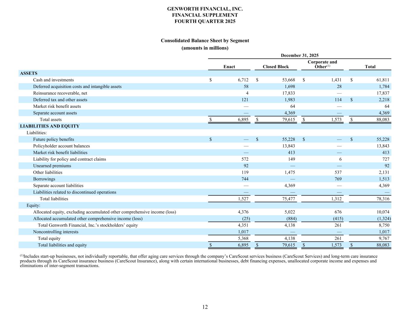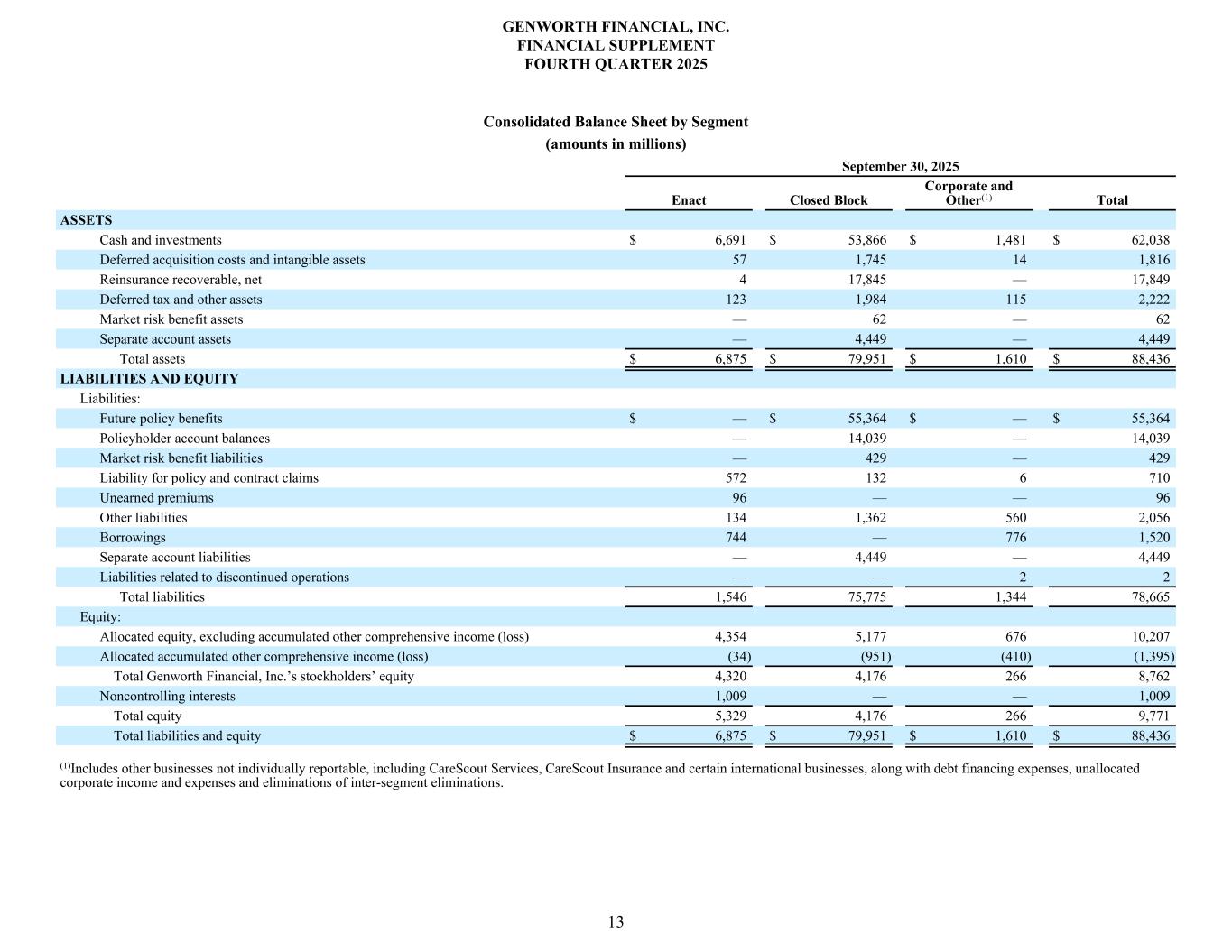 Consolidated Balance Sheet by Segment (amounts in millions) December 31, 2025 Enact Closed Block Corporate and Other(1) Total ASSETS Cash and investments $ 6,712 $ 53,668 $ 1,431 $ 61,811 Deferred acquisition costs and intangible assets 58 1,698 28 1,784 Reinsurance recoverable, net 4 17,833 — 17,837 Deferred tax and other assets 121 1,983 114 $ 2,218 Market risk benefit assets — 64 — 64 Separate account assets — 4,369 — 4,369 Total assets $ 6,895 $ 79,615 $ 1,573 $ 88,083 LIABILITIES AND EQUITY Liabilities: Future policy benefits $ — $ 55,228 $ — $ 55,228 Policyholder account balances — 13,843 — 13,843 Market risk benefit liabilities — 413 — 413 Liability for policy and contract claims 572 149 6 727 Unearned premiums 92 — — 92 Other liabilities 119 1,475 537 2,131 Borrowings 744 — 769 1,513 Separate account liabilities — 4,369 — 4,369 Liabilities related to discontinued operations — — — — Total liabilities 1,527 75,477 1,312 78,316 Equity: Allocated equity, excluding accumulated other comprehensive income (loss) 4,376 5,022 676 10,074 Allocated accumulated other comprehensive income (loss) (25) (884) (415) (1,324) Total Genworth Financial, Inc.’s stockholders’ equity 4,351 4,138 261 8,750 Noncontrolling interests 1,017 — — 1,017 Total equity 5,368 4,138 261 9,767 Total liabilities and equity $ 6,895 $ 79,615 $ 1,573 $ 88,083 (1)Includes start-up businesses, not individually reportable, that offer aging care services through the company’s CareScout services business (CareScout Services) and long-term care insurance products through its CareScout insurance business (CareScout Insurance), along with certain international businesses, debt financing expenses, unallocated corporate income and expenses and eliminations of inter-segment transactions. GENWORTH FINANCIAL, INC. FINANCIAL SUPPLEMENT FOURTH QUARTER 2025 12