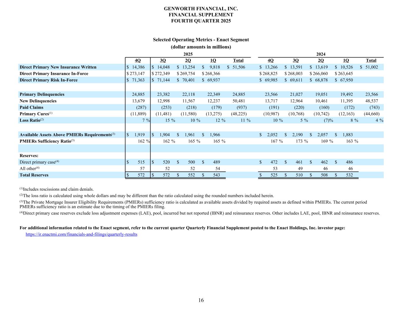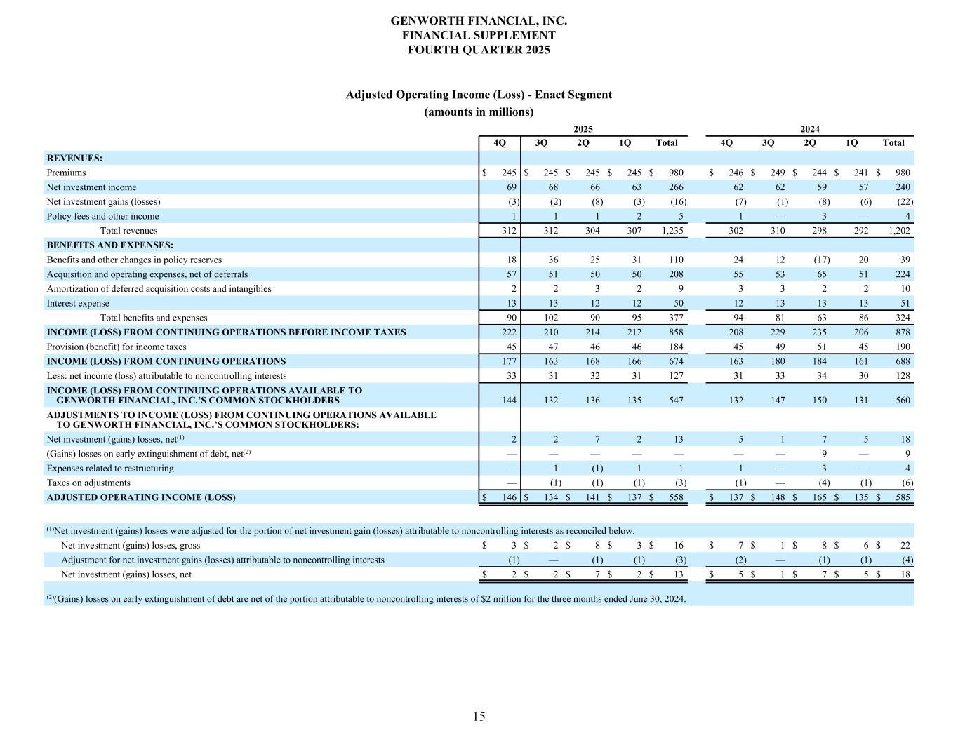 Adjusted Operating Income (Loss) - Enact Segment (amounts in millions) 2025 2024 4Q 3Q 2Q 1Q Total 4Q 3Q 2Q 1Q Total REVENUES: Premiums $ 245 $ 245 $ 245 $ 245 $ 980 $ 246 $ 249 $ 244 $ 241 $ 980 Net investment income 69 68 66 63 266 62 62 59 57 240 Net investment gains (losses) (3) (2) (8) (3) (16) (7) (1) (8) (6) (22) Policy fees and other income 1 1 1 2 5 1 — 3 — 4 Total revenues 312 312 304 307 1,235 302 310 298 292 1,202 BENEFITS AND EXPENSES: Benefits and other changes in policy reserves 18 36 25 31 110 24 12 (17) 20 39 Acquisition and operating expenses, net of deferrals 57 51 50 50 208 55 53 65 51 224 Amortization of deferred acquisition costs and intangibles 2 2 3 2 9 3 3 2 2 10 Interest expense 13 13 12 12 50 12 13 13 13 51 Total benefits and expenses 90 102 90 95 377 94 81 63 86 324 INCOME (LOSS) FROM CONTINUING OPERATIONS BEFORE INCOME TAXES 222 210 214 212 858 208 229 235 206 878 Provision (benefit) for income taxes 45 47 46 46 184 45 49 51 45 190 INCOME (LOSS) FROM CONTINUING OPERATIONS 177 163 168 166 674 163 180 184 161 688 Less: net income (loss) attributable to noncontrolling interests 33 31 32 31 127 31 33 34 30 128 INCOME (LOSS) FROM CONTINUING OPERATIONS AVAILABLE TO GENWORTH FINANCIAL, INC.’S COMMON STOCKHOLDERS 144 132 136 135 547 132 147 150 131 560 ADJUSTMENTS TO INCOME (LOSS) FROM CONTINUING OPERATIONS AVAILABLE TO GENWORTH FINANCIAL, INC.’S COMMON STOCKHOLDERS: Net investment (gains) losses, net(1) 2 2 7 2 13 5 1 7 5 18 (Gains) losses on early extinguishment of debt, net(2) — — — — — — — 9 — 9 Expenses related to restructuring — 1 (1) 1 1 1 — 3 — 4 Taxes on adjustments — (1) (1) (1) (3) (1) — (4) (1) (6) ADJUSTED OPERATING INCOME (LOSS) $ 146 $ 134 $ 141 $ 137 $ 558 $ 137 $ 148 $ 165 $ 135 $ 585 (1)Net investment (gains) losses were adjusted for the portion of net investment gain (losses) attributable to noncontrolling interests as reconciled below: Net investment (gains) losses, gross $ 3 $ 2 $ 8 $ 3 $ 16 $ 7 $ 1 $ 8 $ 6 $ 22 Adjustment for net investment gains (losses) attributable to noncontrolling interests (1) — (1) (1) (3) (2) — (1) (1) (4) Net investment (gains) losses, net $ 2 $ 2 $ 7 $ 2 $ 13 $ 5 $ 1 $ 7 $ 5 $ 18 (2)(Gains) losses on early extinguishment of debt are net of the portion attributable to noncontrolling interests of $2 million for the three months ended June 30, 2024. GENWORTH FINANCIAL, INC. FINANCIAL SUPPLEMENT FOURTH QUARTER 2025 15