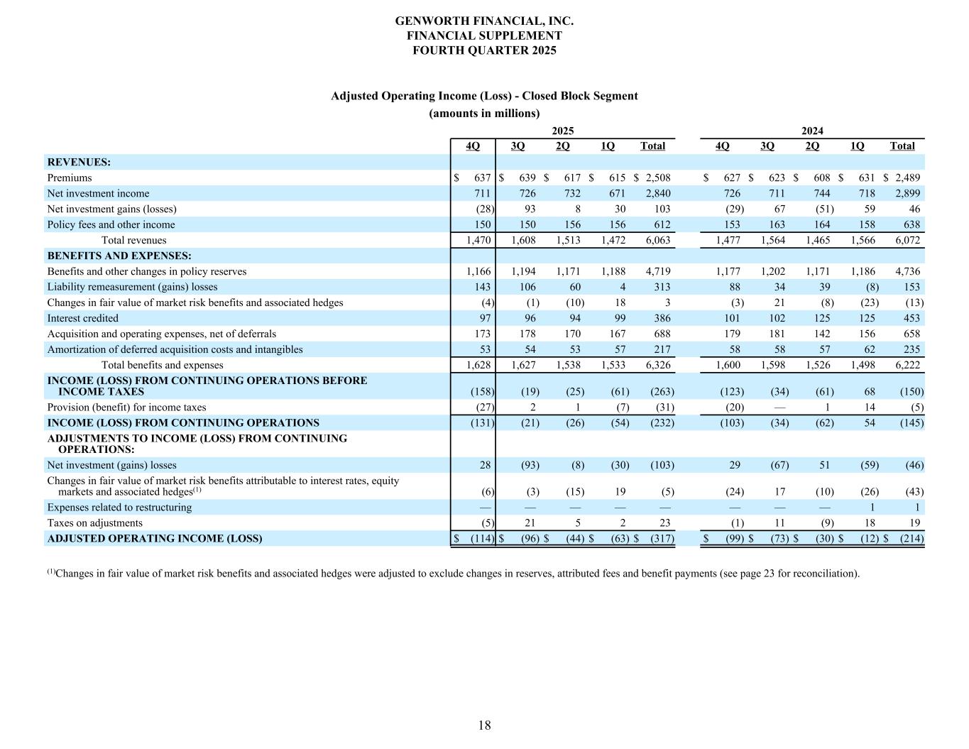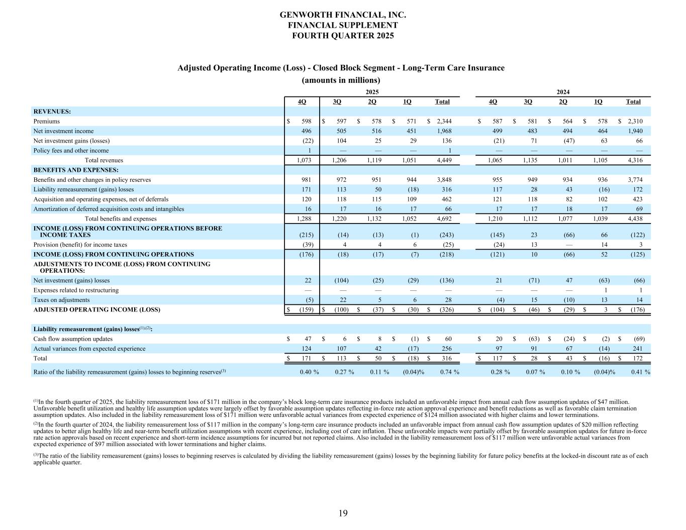 Adjusted Operating Income (Loss) - Closed Block Segment (amounts in millions) 2025 2024 4Q 3Q 2Q 1Q Total 4Q 3Q 2Q 1Q Total REVENUES: Premiums $ 637 $ 639 $ 617 $ 615 $ 2,508 $ 627 $ 623 $ 608 $ 631 $ 2,489 Net investment income 711 726 732 671 2,840 726 711 744 718 2,899 Net investment gains (losses) (28) 93 8 30 103 (29) 67 (51) 59 46 Policy fees and other income 150 150 156 156 612 153 163 164 158 638 Total revenues 1,470 1,608 1,513 1,472 6,063 1,477 1,564 1,465 1,566 6,072 BENEFITS AND EXPENSES: Benefits and other changes in policy reserves 1,166 1,194 1,171 1,188 4,719 1,177 1,202 1,171 1,186 4,736 Liability remeasurement (gains) losses 143 106 60 4 313 88 34 39 (8) 153 Changes in fair value of market risk benefits and associated hedges (4) (1) (10) 18 3 (3) 21 (8) (23) (13) Interest credited 97 96 94 99 386 101 102 125 125 453 Acquisition and operating expenses, net of deferrals 173 178 170 167 688 179 181 142 156 658 Amortization of deferred acquisition costs and intangibles 53 54 53 57 217 58 58 57 62 235 Total benefits and expenses 1,628 1,627 1,538 1,533 6,326 1,600 1,598 1,526 1,498 6,222 INCOME (LOSS) FROM CONTINUING OPERATIONS BEFORE INCOME TAXES (158) (19) (25) (61) (263) (123) (34) (61) 68 (150) Provision (benefit) for income taxes (27) 2 1 (7) (31) (20) — 1 14 (5) INCOME (LOSS) FROM CONTINUING OPERATIONS (131) (21) (26) (54) (232) (103) (34) (62) 54 (145) ADJUSTMENTS TO INCOME (LOSS) FROM CONTINUING OPERATIONS: Net investment (gains) losses 28 (93) (8) (30) (103) 29 (67) 51 (59) (46) Changes in fair value of market risk benefits attributable to interest rates, equity markets and associated hedges(1) (6) (3) (15) 19 (5) (24) 17 (10) (26) (43) Expenses related to restructuring — — — — — — — — 1 1 Taxes on adjustments (5) 21 5 2 23 (1) 11 (9) 18 19 ADJUSTED OPERATING INCOME (LOSS) $ (114) $ (96) $ (44) $ (63) $ (317) $ (99) $ (73) $ (30) $ (12) $ (214) (1)Changes in fair value of market risk benefits and associated hedges were adjusted to exclude changes in reserves, attributed fees and benefit payments (see page 23 for reconciliation). GENWORTH FINANCIAL, INC. FINANCIAL SUPPLEMENT FOURTH QUARTER 2025 18