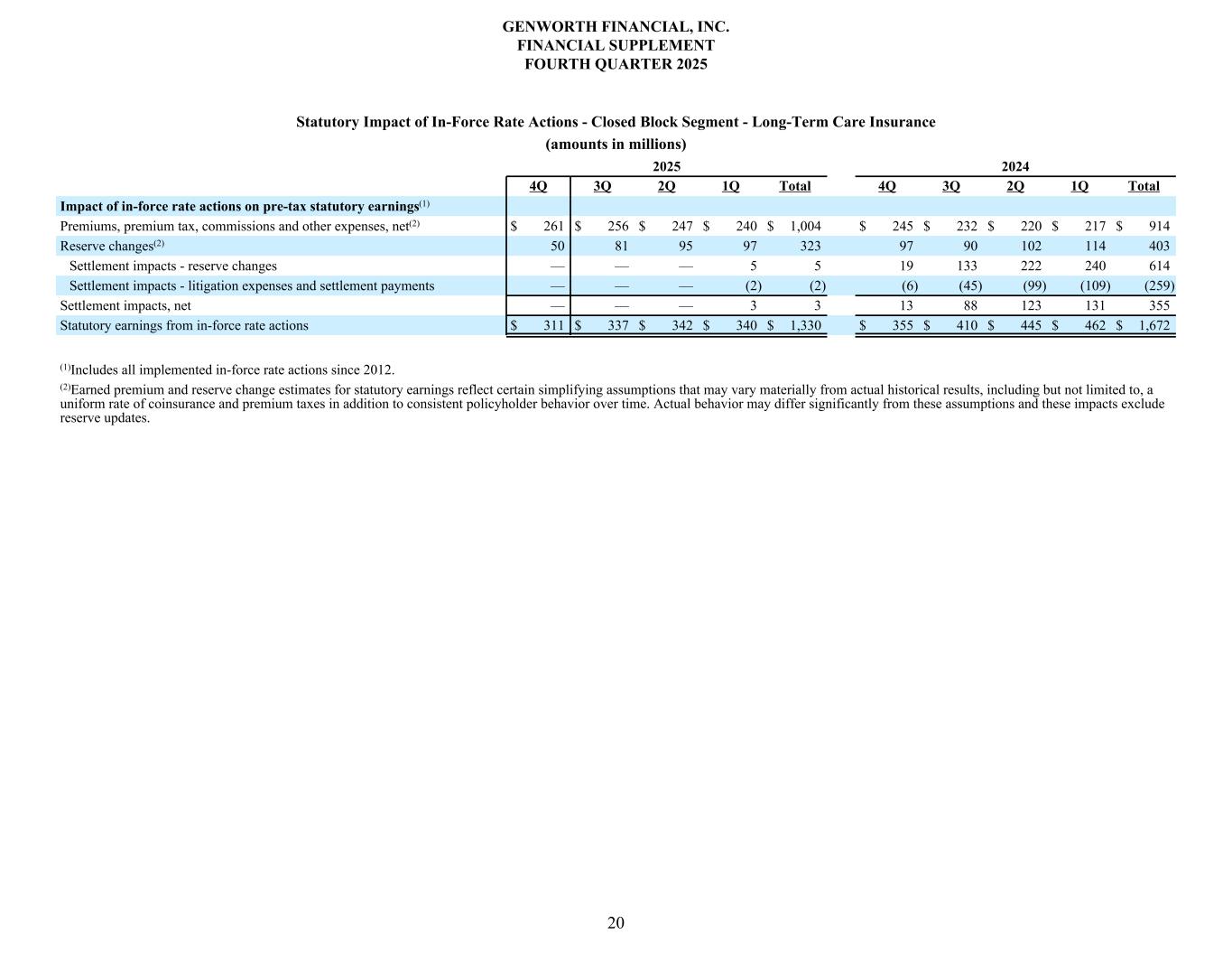 Statutory Impact of In-Force Rate Actions - Closed Block Segment - Long-Term Care Insurance (amounts in millions) 2025 2024 4Q 3Q 2Q 1Q Total 4Q 3Q 2Q 1Q Total Impact of in-force rate actions on pre-tax statutory earnings(1) Premiums, premium tax, commissions and other expenses, net(2) $ 261 $ 256 $ 247 $ 240 $ 1,004 $ 245 $ 232 $ 220 $ 217 $ 914 Reserve changes(2) 50 81 95 97 323 97 90 102 114 403 Settlement impacts - reserve changes — — — 5 5 19 133 222 240 614 Settlement impacts - litigation expenses and settlement payments — — — (2) (2) (6) (45) (99) (109) (259) Settlement impacts, net — — — 3 3 13 88 123 131 355 Statutory earnings from in-force rate actions $ 311 $ 337 $ 342 $ 340 $ 1,330 $ 355 $ 410 $ 445 $ 462 $ 1,672 (1)Includes all implemented in-force rate actions since 2012. (2)Earned premium and reserve change estimates for statutory earnings reflect certain simplifying assumptions that may vary materially from actual historical results, including but not limited to, a uniform rate of coinsurance and premium taxes in addition to consistent policyholder behavior over time. Actual behavior may differ significantly from these assumptions and these impacts exclude reserve updates. GENWORTH FINANCIAL, INC. FINANCIAL SUPPLEMENT FOURTH QUARTER 2025 20
