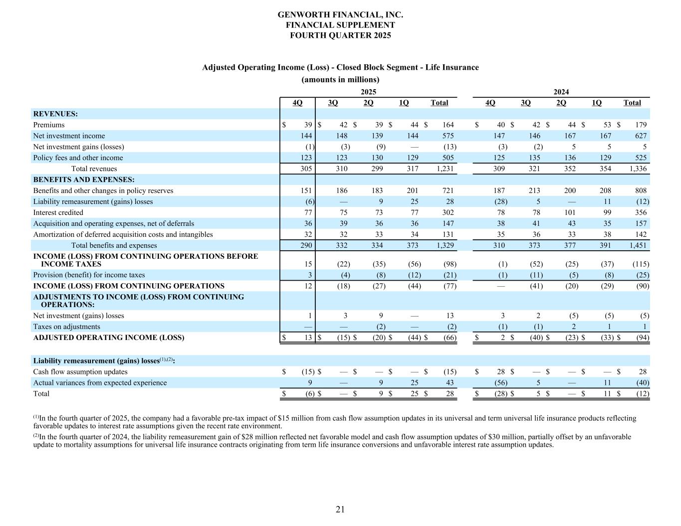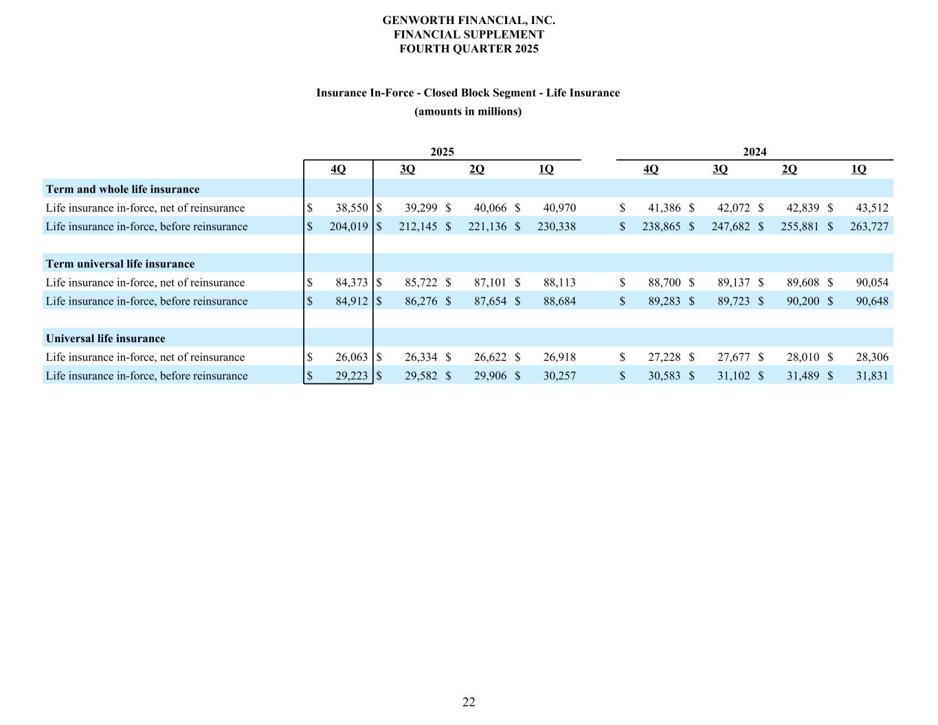 Adjusted Operating Income (Loss) - Closed Block Segment - Life Insurance (amounts in millions) 2025 2024 4Q 3Q 2Q 1Q Total 4Q 3Q 2Q 1Q Total REVENUES: Premiums $ 39 $ 42 $ 39 $ 44 $ 164 $ 40 $ 42 $ 44 $ 53 $ 179 Net investment income 144 148 139 144 575 147 146 167 167 627 Net investment gains (losses) (1) (3) (9) — (13) (3) (2) 5 5 5 Policy fees and other income 123 123 130 129 505 125 135 136 129 525 Total revenues 305 310 299 317 1,231 309 321 352 354 1,336 BENEFITS AND EXPENSES: Benefits and other changes in policy reserves 151 186 183 201 721 187 213 200 208 808 Liability remeasurement (gains) losses (6) — 9 25 28 (28) 5 — 11 (12) Interest credited 77 75 73 77 302 78 78 101 99 356 Acquisition and operating expenses, net of deferrals 36 39 36 36 147 38 41 43 35 157 Amortization of deferred acquisition costs and intangibles 32 32 33 34 131 35 36 33 38 142 Total benefits and expenses 290 332 334 373 1,329 310 373 377 391 1,451 INCOME (LOSS) FROM CONTINUING OPERATIONS BEFORE INCOME TAXES 15 (22) (35) (56) (98) (1) (52) (25) (37) (115) Provision (benefit) for income taxes 3 (4) (8) (12) (21) (1) (11) (5) (8) (25) INCOME (LOSS) FROM CONTINUING OPERATIONS 12 (18) (27) (44) (77) — (41) (20) (29) (90) ADJUSTMENTS TO INCOME (LOSS) FROM CONTINUING OPERATIONS: Net investment (gains) losses 1 3 9 — 13 3 2 (5) (5) (5) Taxes on adjustments — — (2) — (2) (1) (1) 2 1 1 ADJUSTED OPERATING INCOME (LOSS) $ 13 $ (15) $ (20) $ (44) $ (66) $ 2 $ (40) $ (23) $ (33) $ (94) Liability remeasurement (gains) losses(1),(2): Cash flow assumption updates $ (15) $ — $ — $ — $ (15) $ 28 $ — $ — $ — $ 28 Actual variances from expected experience 9 — 9 25 43 (56) 5 — 11 (40) Total $ (6) $ — $ 9 $ 25 $ 28 $ (28) $ 5 $ — $ 11 $ (12) (1)In the fourth quarter of 2025, the company had a favorable pre-tax impact of $15 million from cash flow assumption updates in its universal and term universal life insurance products reflecting favorable updates to interest rate assumptions given the recent rate environment. (2)In the fourth quarter of 2024, the liability remeasurement gain of $28 million reflected net favorable model and cash flow assumption updates of $30 million, partially offset by an unfavorable update to mortality assumptions for universal life insurance contracts originating from term life insurance conversions and unfavorable interest rate assumption updates. GENWORTH FINANCIAL, INC. FINANCIAL SUPPLEMENT FOURTH QUARTER 2025 21