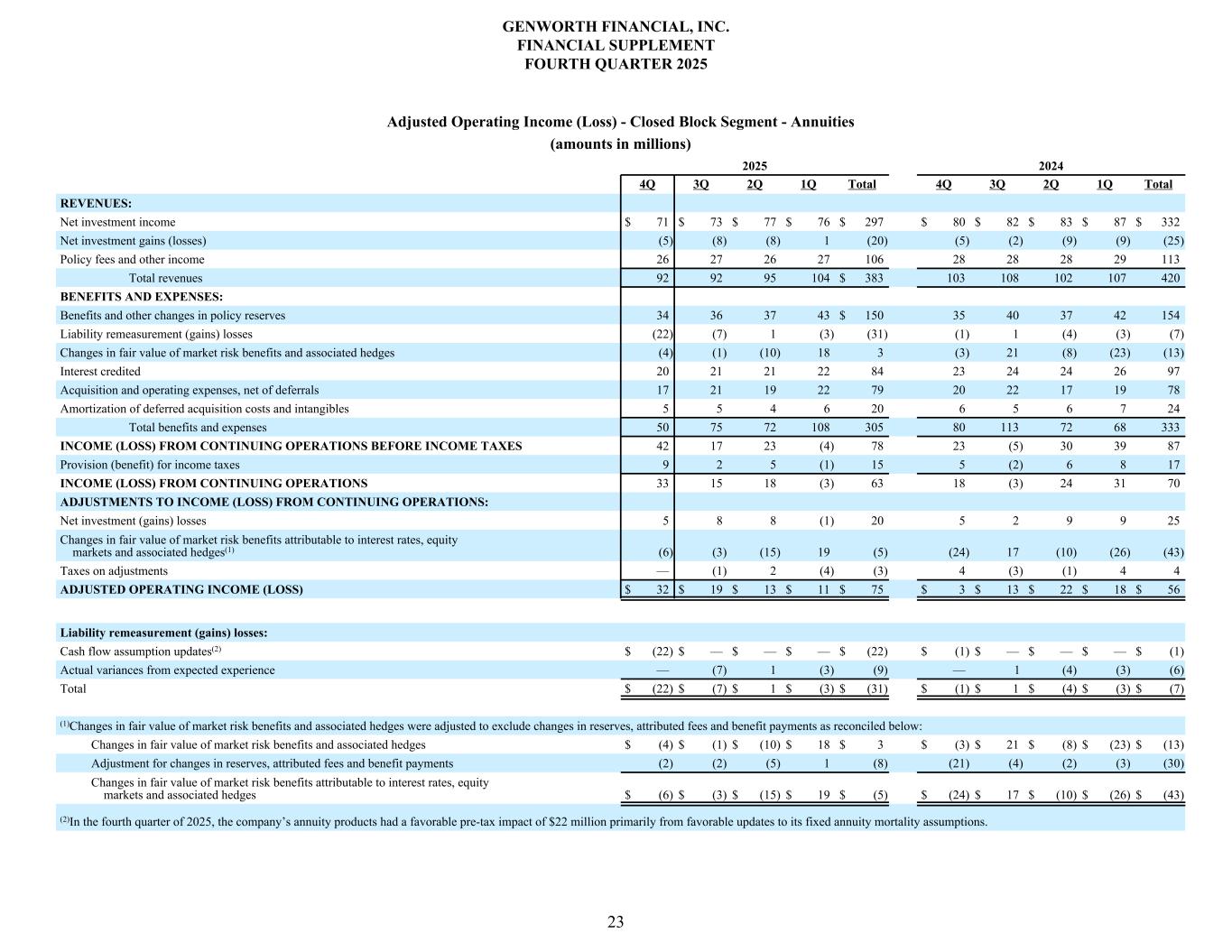 Adjusted Operating Income (Loss) - Closed Block Segment - Annuities (amounts in millions) 2025 2024 4Q 3Q 2Q 1Q Total 4Q 3Q 2Q 1Q Total REVENUES: Net investment income $ 71 $ 73 $ 77 $ 76 $ 297 $ 80 $ 82 $ 83 $ 87 $ 332 Net investment gains (losses) (5) (8) (8) 1 (20) (5) (2) (9) (9) (25) Policy fees and other income 26 27 26 27 106 28 28 28 29 113 Total revenues 92 92 95 104 $ 383 103 108 102 107 420 BENEFITS AND EXPENSES: Benefits and other changes in policy reserves 34 36 37 43 $ 150 35 40 37 42 154 Liability remeasurement (gains) losses (22) (7) 1 (3) (31) (1) 1 (4) (3) (7) Changes in fair value of market risk benefits and associated hedges (4) (1) (10) 18 3 (3) 21 (8) (23) (13) Interest credited 20 21 21 22 84 23 24 24 26 97 Acquisition and operating expenses, net of deferrals 17 21 19 22 79 20 22 17 19 78 Amortization of deferred acquisition costs and intangibles 5 5 4 6 20 6 5 6 7 24 Total benefits and expenses 50 75 72 108 305 80 113 72 68 333 INCOME (LOSS) FROM CONTINUING OPERATIONS BEFORE INCOME TAXES 42 17 23 (4) 78 23 (5) 30 39 87 Provision (benefit) for income taxes 9 2 5 (1) 15 5 (2) 6 8 17 INCOME (LOSS) FROM CONTINUING OPERATIONS 33 15 18 (3) 63 18 (3) 24 31 70 ADJUSTMENTS TO INCOME (LOSS) FROM CONTINUING OPERATIONS: Net investment (gains) losses 5 8 8 (1) 20 5 2 9 9 25 Changes in fair value of market risk benefits attributable to interest rates, equity markets and associated hedges(1) (6) (3) (15) 19 (5) (24) 17 (10) (26) (43) Taxes on adjustments — (1) 2 (4) (3) 4 (3) (1) 4 4 ADJUSTED OPERATING INCOME (LOSS) $ 32 $ 19 $ 13 $ 11 $ 75 $ 3 $ 13 $ 22 $ 18 $ 56 Liability remeasurement (gains) losses: Cash flow assumption updates(2) $ (22) $ — $ — $ — $ (22) $ (1) $ — $ — $ — $ (1) Actual variances from expected experience — (7) 1 (3) (9) — 1 (4) (3) (6) Total $ (22) $ (7) $ 1 $ (3) $ (31) $ (1) $ 1 $ (4) $ (3) $ (7) (1)Changes in fair value of market risk benefits and associated hedges were adjusted to exclude changes in reserves, attributed fees and benefit payments as reconciled below: Changes in fair value of market risk benefits and associated hedges $ (4) $ (1) $ (10) $ 18 $ 3 $ (3) $ 21 $ (8) $ (23) $ (13) Adjustment for changes in reserves, attributed fees and benefit payments (2) (2) (5) 1 (8) (21) (4) (2) (3) (30) Changes in fair value of market risk benefits attributable to interest rates, equity markets and associated hedges $ (6) $ (3) $ (15) $ 19 $ (5) $ (24) $ 17 $ (10) $ (26) $ (43) (2)In the fourth quarter of 2025, the company’s annuity products had a favorable pre-tax impact of $22 million primarily from favorable updates to its fixed annuity mortality assumptions. GENWORTH FINANCIAL, INC. FINANCIAL SUPPLEMENT FOURTH QUARTER 2025 23