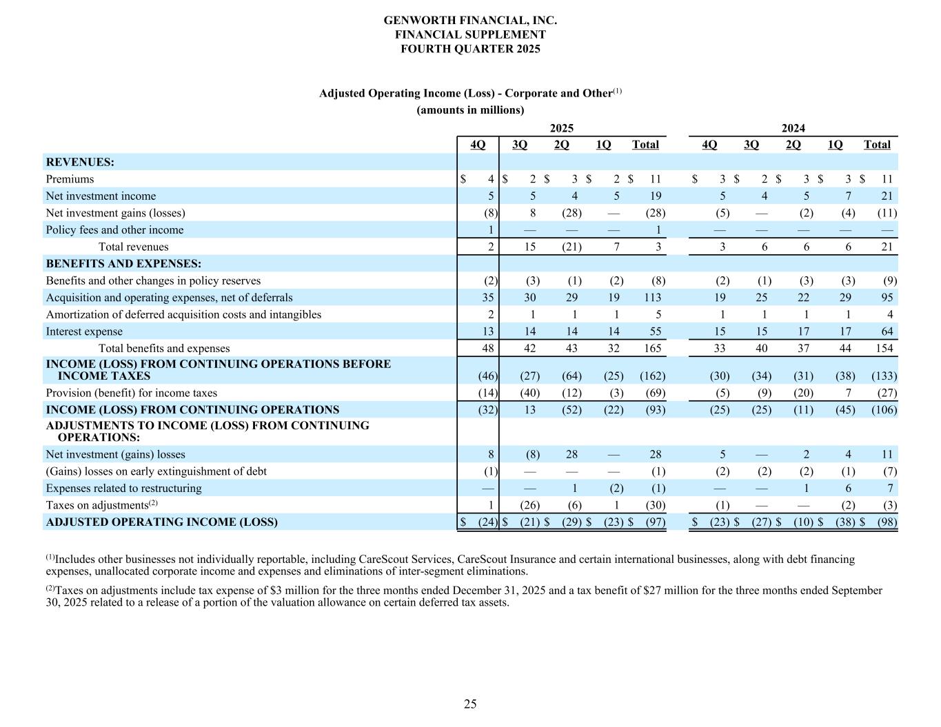 Adjusted Operating Income (Loss) - Corporate and Other(1) (amounts in millions) 2025 2024 4Q 3Q 2Q 1Q Total 4Q 3Q 2Q 1Q Total REVENUES: Premiums $ 4 $ 2 $ 3 $ 2 $ 11 $ 3 $ 2 $ 3 $ 3 $ 11 Net investment income 5 5 4 5 19 5 4 5 7 21 Net investment gains (losses) (8) 8 (28) — (28) (5) — (2) (4) (11) Policy fees and other income 1 — — — 1 — — — — — Total revenues 2 15 (21) 7 3 3 6 6 6 21 BENEFITS AND EXPENSES: Benefits and other changes in policy reserves (2) (3) (1) (2) (8) (2) (1) (3) (3) (9) Acquisition and operating expenses, net of deferrals 35 30 29 19 113 19 25 22 29 95 Amortization of deferred acquisition costs and intangibles 2 1 1 1 5 1 1 1 1 4 Interest expense 13 14 14 14 55 15 15 17 17 64 Total benefits and expenses 48 42 43 32 165 33 40 37 44 154 INCOME (LOSS) FROM CONTINUING OPERATIONS BEFORE INCOME TAXES (46) (27) (64) (25) (162) (30) (34) (31) (38) (133) Provision (benefit) for income taxes (14) (40) (12) (3) (69) (5) (9) (20) 7 (27) INCOME (LOSS) FROM CONTINUING OPERATIONS (32) 13 (52) (22) (93) (25) (25) (11) (45) (106) ADJUSTMENTS TO INCOME (LOSS) FROM CONTINUING OPERATIONS: Net investment (gains) losses 8 (8) 28 — 28 5 — 2 4 11 (Gains) losses on early extinguishment of debt (1) — — — (1) (2) (2) (2) (1) (7) Expenses related to restructuring — — 1 (2) (1) — — 1 6 7 Taxes on adjustments(2) 1 (26) (6) 1 (30) (1) — — (2) (3) ADJUSTED OPERATING INCOME (LOSS) $ (24) $ (21) $ (29) $ (23) $ (97) $ (23) $ (27) $ (10) $ (38) $ (98) (1)Includes other businesses not individually reportable, including CareScout Services, CareScout Insurance and certain international businesses, along with debt financing expenses, unallocated corporate income and expenses and eliminations of inter-segment eliminations. (2)Taxes on adjustments include tax expense of $3 million for the three months ended December 31, 2025 and a tax benefit of $27 million for the three months ended September 30, 2025 related to a release of a portion of the valuation allowance on certain deferred tax assets. GENWORTH FINANCIAL, INC. FINANCIAL SUPPLEMENT FOURTH QUARTER 2025 25