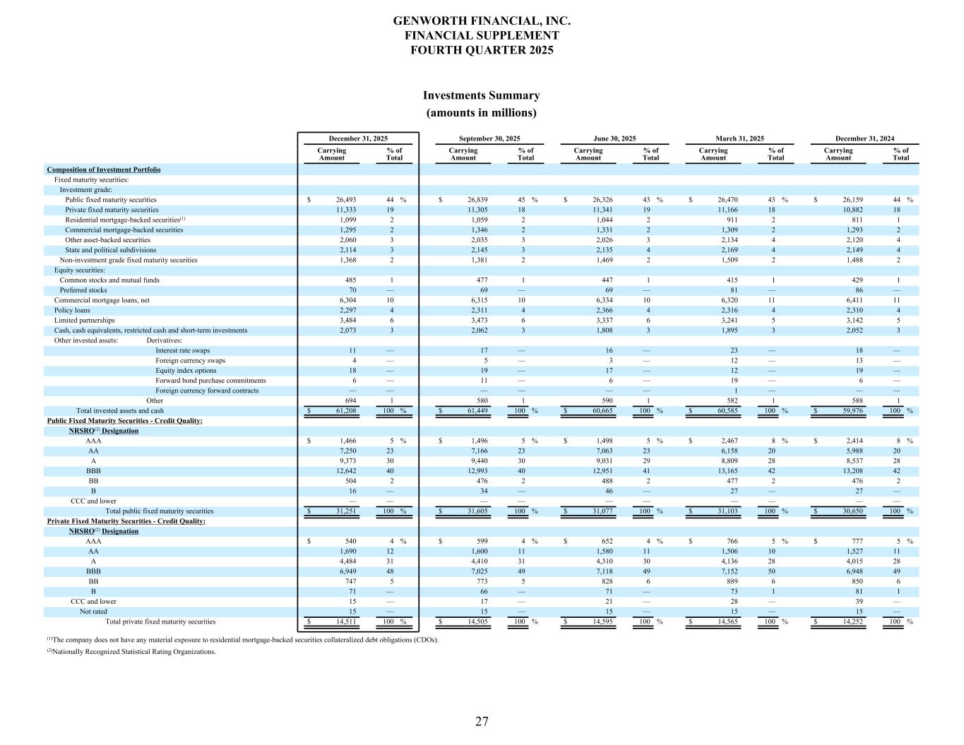 Investments Summary (amounts in millions) December 31, 2025 September 30, 2025 June 30, 2025 March 31, 2025 December 31, 2024 Carrying Amount % of Total Carrying Amount % of Total Carrying Amount % of Total Carrying Amount % of Total Carrying Amount % of Total Composition of Investment Portfolio Fixed maturity securities: Investment grade: Public fixed maturity securities $ 26,493 44 % $ 26,839 45 % $ 26,326 43 % $ 26,470 43 % $ 26,159 44 % Private fixed maturity securities 11,333 19 11,305 18 11,341 19 11,166 18 10,882 18 Residential mortgage-backed securities(1) 1,099 2 1,059 2 1,044 2 911 2 811 1 Commercial mortgage-backed securities 1,295 2 1,346 2 1,331 2 1,309 2 1,293 2 Other asset-backed securities 2,060 3 2,035 3 2,026 3 2,134 4 2,120 4 State and political subdivisions 2,114 3 2,145 3 2,135 4 2,169 4 2,149 4 Non-investment grade fixed maturity securities 1,368 2 1,381 2 1,469 2 1,509 2 1,488 2 Equity securities: Common stocks and mutual funds 485 1 477 1 447 1 415 1 429 1 Preferred stocks 70 — 69 — 69 — 81 — 86 — Commercial mortgage loans, net 6,304 10 6,315 10 6,334 10 6,320 11 6,411 11 Policy loans 2,297 4 2,311 4 2,366 4 2,316 4 2,310 4 Limited partnerships 3,484 6 3,473 6 3,337 6 3,241 5 3,142 5 Cash, cash equivalents, restricted cash and short-term investments 2,073 3 2,062 3 1,808 3 1,895 3 2,052 3 Other invested assets: Derivatives: Interest rate swaps 11 — 17 — 16 — 23 — 18 — Foreign currency swaps 4 — 5 — 3 — 12 — 13 — Equity index options 18 — 19 — 17 — 12 — 19 — Forward bond purchase commitments 6 — 11 — 6 — 19 — 6 — Foreign currency forward contracts — — — — — — 1 — — — Other 694 1 580 1 590 1 582 1 588 1 Total invested assets and cash $ 61,208 100 % $ 61,449 100 % $ 60,665 100 % $ 60,585 100 % $ 59,976 100 % Public Fixed Maturity Securities - Credit Quality: NRSRO(2) Designation AAA $ 1,466 5 % $ 1,496 5 % $ 1,498 5 % $ 2,467 8 % $ 2,414 8 % AA 7,250 23 7,166 23 7,063 23 6,158 20 5,988 20 A 9,373 30 9,440 30 9,031 29 8,809 28 8,537 28 BBB 12,642 40 12,993 40 12,951 41 13,165 42 13,208 42 BB 504 2 476 2 488 2 477 2 476 2 B 16 — 34 — 46 — 27 — 27 — CCC and lower — — — — — — — — — — Total public fixed maturity securities $ 31,251 100 % $ 31,605 100 % $ 31,077 100 % $ 31,103 100 % $ 30,650 100 % Private Fixed Maturity Securities - Credit Quality: NRSRO(2) Designation AAA $ 540 4 % $ 599 4 % $ 652 4 % $ 766 5 % $ 777 5 % AA 1,690 12 1,600 11 1,580 11 1,506 10 1,527 11 A 4,484 31 4,410 31 4,310 30 4,136 28 4,015 28 BBB 6,949 48 7,025 49 7,118 49 7,152 50 6,948 49 BB 747 5 773 5 828 6 889 6 850 6 B 71 — 66 — 71 — 73 1 81 1 CCC and lower 15 — 17 — 21 — 28 — 39 — Not rated 15 — 15 — 15 — 15 — 15 — Total private fixed maturity securities $ 14,511 100 % $ 14,505 100 % $ 14,595 100 % $ 14,565 100 % $ 14,252 100 % (1)The company does not have any material exposure to residential mortgage-backed securities collateralized debt obligations (CDOs). (2)Nationally Recognized Statistical Rating Organizations. GENWORTH FINANCIAL, INC. FINANCIAL SUPPLEMENT FOURTH QUARTER 2025 27
