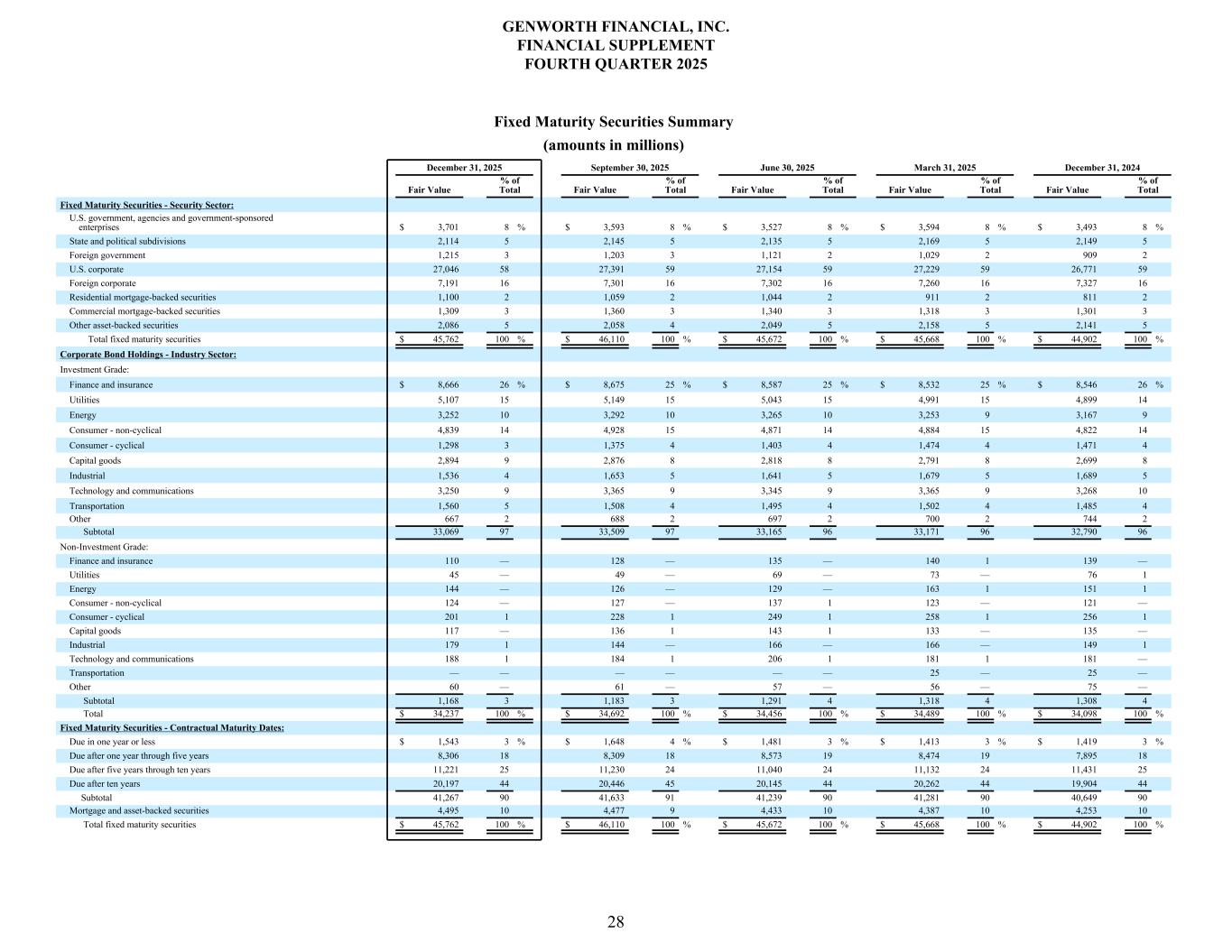 Fixed Maturity Securities Summary (amounts in millions) December 31, 2025 September 30, 2025 June 30, 2025 March 31, 2025 December 31, 2024 Fair Value % of Total Fair Value % of Total Fair Value % of Total Fair Value % of Total Fair Value % of Total Fixed Maturity Securities - Security Sector: U.S. government, agencies and government-sponsored enterprises $ 3,701 8 % $ 3,593 8 % $ 3,527 8 % $ 3,594 8 % $ 3,493 8 % State and political subdivisions 2,114 5 2,145 5 2,135 5 2,169 5 2,149 5 Foreign government 1,215 3 1,203 3 1,121 2 1,029 2 909 2 U.S. corporate 27,046 58 27,391 59 27,154 59 27,229 59 26,771 59 Foreign corporate 7,191 16 7,301 16 7,302 16 7,260 16 7,327 16 Residential mortgage-backed securities 1,100 2 1,059 2 1,044 2 911 2 811 2 Commercial mortgage-backed securities 1,309 3 1,360 3 1,340 3 1,318 3 1,301 3 Other asset-backed securities 2,086 5 2,058 4 2,049 5 2,158 5 2,141 5 Total fixed maturity securities $ 45,762 100 % $ 46,110 100 % $ 45,672 100 % $ 45,668 100 % $ 44,902 100 % Corporate Bond Holdings - Industry Sector: Investment Grade: Finance and insurance $ 8,666 26 % $ 8,675 25 % $ 8,587 25 % $ 8,532 25 % $ 8,546 26 % Utilities 5,107 15 5,149 15 5,043 15 4,991 15 4,899 14 Energy 3,252 10 3,292 10 3,265 10 3,253 9 3,167 9 Consumer - non-cyclical 4,839 14 4,928 15 4,871 14 4,884 15 4,822 14 Consumer - cyclical 1,298 3 1,375 4 1,403 4 1,474 4 1,471 4 Capital goods 2,894 9 2,876 8 2,818 8 2,791 8 2,699 8 Industrial 1,536 4 1,653 5 1,641 5 1,679 5 1,689 5 Technology and communications 3,250 9 3,365 9 3,345 9 3,365 9 3,268 10 Transportation 1,560 5 1,508 4 1,495 4 1,502 4 1,485 4 Other 667 2 688 2 697 2 700 2 744 2 Subtotal 33,069 97 33,509 97 33,165 96 33,171 96 32,790 96 Non-Investment Grade: Finance and insurance 110 — 128 — 135 — 140 1 139 — Utilities 45 — 49 — 69 — 73 — 76 1 Energy 144 — 126 — 129 — 163 1 151 1 Consumer - non-cyclical 124 — 127 — 137 1 123 — 121 — Consumer - cyclical 201 1 228 1 249 1 258 1 256 1 Capital goods 117 — 136 1 143 1 133 — 135 — Industrial 179 1 144 — 166 — 166 — 149 1 Technology and communications 188 1 184 1 206 1 181 1 181 — Transportation — — — — — — 25 — 25 — Other 60 — 61 — 57 — 56 — 75 — Subtotal 1,168 3 1,183 3 1,291 4 1,318 4 1,308 4 Total $ 34,237 100 % $ 34,692 100 % $ 34,456 100 % $ 34,489 100 % $ 34,098 100 % Fixed Maturity Securities - Contractual Maturity Dates: Due in one year or less $ 1,543 3 % $ 1,648 4 % $ 1,481 3 % $ 1,413 3 % $ 1,419 3 % Due after one year through five years 8,306 18 8,309 18 8,573 19 8,474 19 7,895 18 Due after five years through ten years 11,221 25 11,230 24 11,040 24 11,132 24 11,431 25 Due after ten years 20,197 44 20,446 45 20,145 44 20,262 44 19,904 44 Subtotal 41,267 90 41,633 91 41,239 90 41,281 90 40,649 90 Mortgage and asset-backed securities 4,495 10 4,477 9 4,433 10 4,387 10 4,253 10 Total fixed maturity securities $ 45,762 100 % $ 46,110 100 % $ 45,672 100 % $ 45,668 100 % $ 44,902 100 % GENWORTH FINANCIAL, INC. FINANCIAL SUPPLEMENT FOURTH QUARTER 2025 28