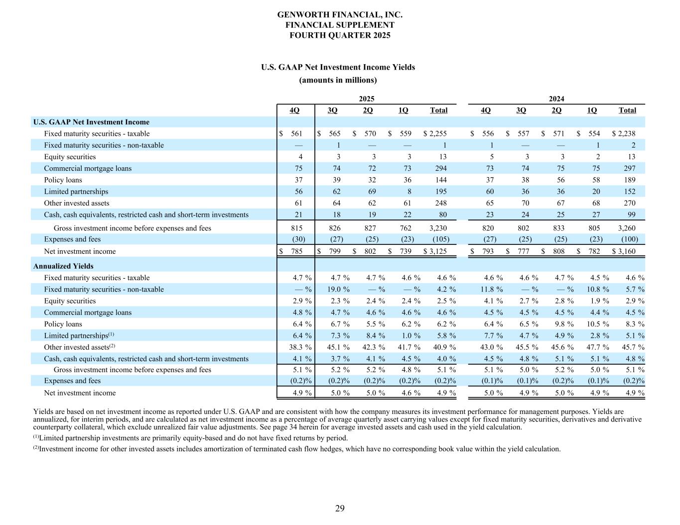 U.S. GAAP Net Investment Income Yields (amounts in millions) 2025 2024 4Q 3Q 2Q 1Q Total 4Q 3Q 2Q 1Q Total U.S. GAAP Net Investment Income Fixed maturity securities - taxable $ 561 $ 565 $ 570 $ 559 $ 2,255 $ 556 $ 557 $ 571 $ 554 $ 2,238 Fixed maturity securities - non-taxable — 1 — — 1 1 — — 1 2 Equity securities 4 3 3 3 13 5 3 3 2 13 Commercial mortgage loans 75 74 72 73 294 73 74 75 75 297 Policy loans 37 39 32 36 144 37 38 56 58 189 Limited partnerships 56 62 69 8 195 60 36 36 20 152 Other invested assets 61 64 62 61 248 65 70 67 68 270 Cash, cash equivalents, restricted cash and short-term investments 21 18 19 22 80 23 24 25 27 99 Gross investment income before expenses and fees 815 826 827 762 3,230 820 802 833 805 3,260 Expenses and fees (30) (27) (25) (23) (105) (27) (25) (25) (23) (100) Net investment income $ 785 $ 799 $ 802 $ 739 $ 3,125 $ 793 $ 777 $ 808 $ 782 $ 3,160 Annualized Yields Fixed maturity securities - taxable 4.7 % 4.7 % 4.7 % 4.6 % 4.6 % 4.6 % 4.6 % 4.7 % 4.5 % 4.6 % Fixed maturity securities - non-taxable — % 19.0 % — % — % 4.2 % 11.8 % — % — % 10.8 % 5.7 % Equity securities 2.9 % 2.3 % 2.4 % 2.4 % 2.5 % 4.1 % 2.7 % 2.8 % 1.9 % 2.9 % Commercial mortgage loans 4.8 % 4.7 % 4.6 % 4.6 % 4.6 % 4.5 % 4.5 % 4.5 % 4.4 % 4.5 % Policy loans 6.4 % 6.7 % 5.5 % 6.2 % 6.2 % 6.4 % 6.5 % 9.8 % 10.5 % 8.3 % Limited partnerships(1) 6.4 % 7.3 % 8.4 % 1.0 % 5.8 % 7.7 % 4.7 % 4.9 % 2.8 % 5.1 % Other invested assets(2) 38.3 % 45.1 % 42.3 % 41.7 % 40.9 % 43.0 % 45.5 % 45.6 % 47.7 % 45.7 % Cash, cash equivalents, restricted cash and short-term investments 4.1 % 3.7 % 4.1 % 4.5 % 4.0 % 4.5 % 4.8 % 5.1 % 5.1 % 4.8 % Gross investment income before expenses and fees 5.1 % 5.2 % 5.2 % 4.8 % 5.1 % 5.1 % 5.0 % 5.2 % 5.0 % 5.1 % Expenses and fees (0.2) % (0.2) % (0.2) % (0.2) % (0.2) % (0.1) % (0.1) % (0.2) % (0.1) % (0.2) % Net investment income 4.9 % 5.0 % 5.0 % 4.6 % 4.9 % 5.0 % 4.9 % 5.0 % 4.9 % 4.9 % Yields are based on net investment income as reported under U.S. GAAP and are consistent with how the company measures its investment performance for management purposes. Yields are annualized, for interim periods, and are calculated as net investment income as a percentage of average quarterly asset carrying values except for fixed maturity securities, derivatives and derivative counterparty collateral, which exclude unrealized fair value adjustments. See page 34 herein for average invested assets and cash used in the yield calculation. (1)Limited partnership investments are primarily equity-based and do not have fixed returns by period. (2)Investment income for other invested assets includes amortization of terminated cash flow hedges, which have no corresponding book value within the yield calculation. GENWORTH FINANCIAL, INC. FINANCIAL SUPPLEMENT FOURTH QUARTER 2025 29