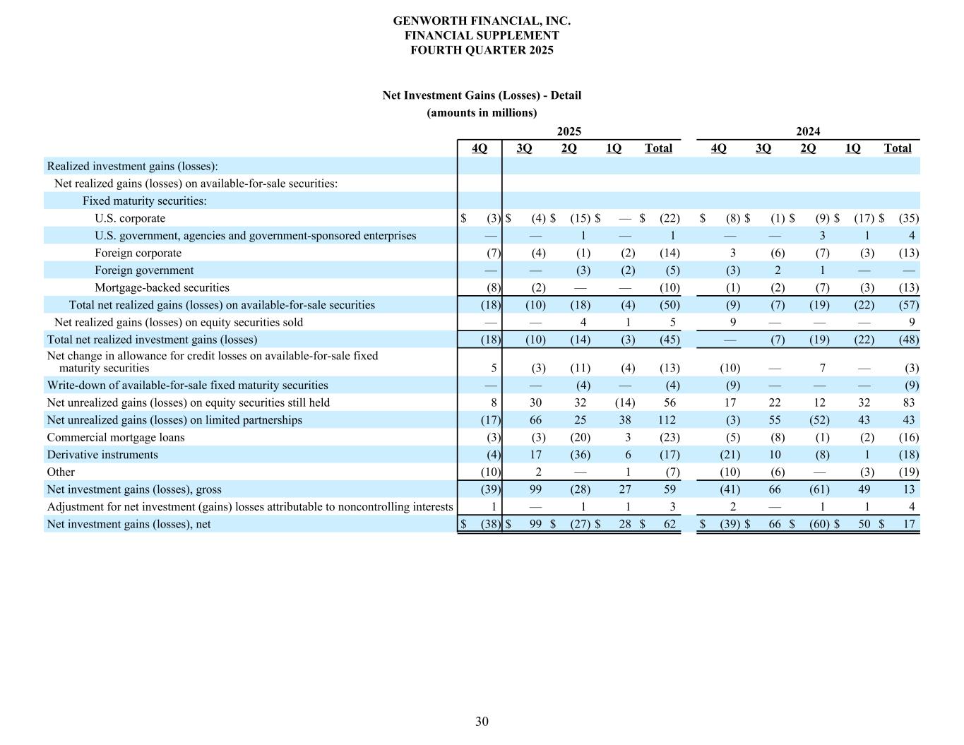 Net Investment Gains (Losses) - Detail (amounts in millions) 2025 2024 4Q 3Q 2Q 1Q Total 4Q 3Q 2Q 1Q Total Realized investment gains (losses): Net realized gains (losses) on available-for-sale securities: Fixed maturity securities: U.S. corporate $ (3) $ (4) $ (15) $ — $ (22) $ (8) $ (1) $ (9) $ (17) $ (35) U.S. government, agencies and government-sponsored enterprises — — 1 — 1 — — 3 1 4 Foreign corporate (7) (4) (1) (2) (14) 3 (6) (7) (3) (13) Foreign government — — (3) (2) (5) (3) 2 1 — — Mortgage-backed securities (8) (2) — — (10) (1) (2) (7) (3) (13) Total net realized gains (losses) on available-for-sale securities (18) (10) (18) (4) (50) (9) (7) (19) (22) (57) Net realized gains (losses) on equity securities sold — — 4 1 5 9 — — — 9 Total net realized investment gains (losses) (18) (10) (14) (3) (45) — (7) (19) (22) (48) Net change in allowance for credit losses on available-for-sale fixed maturity securities 5 (3) (11) (4) (13) (10) — 7 — (3) Write-down of available-for-sale fixed maturity securities — — (4) — (4) (9) — — — (9) Net unrealized gains (losses) on equity securities still held 8 30 32 (14) 56 17 22 12 32 83 Net unrealized gains (losses) on limited partnerships (17) 66 25 38 112 (3) 55 (52) 43 43 Commercial mortgage loans (3) (3) (20) 3 (23) (5) (8) (1) (2) (16) Derivative instruments (4) 17 (36) 6 (17) (21) 10 (8) 1 (18) Other (10) 2 — 1 (7) (10) (6) — (3) (19) Net investment gains (losses), gross (39) 99 (28) 27 59 (41) 66 (61) 49 13 Adjustment for net investment (gains) losses attributable to noncontrolling interests 1 — 1 1 3 2 — 1 1 4 Net investment gains (losses), net $ (38) $ 99 $ (27) $ 28 $ 62 $ (39) $ 66 $ (60) $ 50 $ 17 GENWORTH FINANCIAL, INC. FINANCIAL SUPPLEMENT FOURTH QUARTER 2025 30