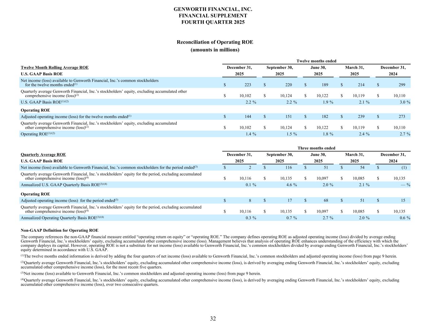 Reconciliation of Operating ROE (amounts in millions) Twelve months ended Twelve Month Rolling Average ROE December 31, September 30, June 30, March 31, December 31, U.S. GAAP Basis ROE 2025 2025 2025 2025 2024 Net income (loss) available to Genworth Financial, Inc.’s common stockholders for the twelve months ended(1) $ 223 $ 220 $ 189 $ 214 $ 299 Quarterly average Genworth Financial, Inc.’s stockholders’ equity, excluding accumulated other comprehensive income (loss)(2) $ 10,102 $ 10,124 $ 10,122 $ 10,119 $ 10,110 U.S. GAAP Basis ROE(1)/(2) 2.2 % 2.2 % 1.9 % 2.1 % 3.0 % Operating ROE Adjusted operating income (loss) for the twelve months ended(1) $ 144 $ 151 $ 182 $ 239 $ 273 Quarterly average Genworth Financial, Inc.’s stockholders’ equity, excluding accumulated other comprehensive income (loss)(2) $ 10,102 $ 10,124 $ 10,122 $ 10,119 $ 10,110 Operating ROE(1)/(2) 1.4 % 1.5 % 1.8 % 2.4 % 2.7 % Three months ended Quarterly Average ROE December 31, September 30, June 30, March 31, December 31, U.S. GAAP Basis ROE 2025 2025 2025 2025 2024 Net income (loss) available to Genworth Financial, Inc.’s common stockholders for the period ended(3) $ 2 $ 116 $ 51 $ 54 $ (1) Quarterly average Genworth Financial, Inc.’s stockholders’ equity for the period, excluding accumulated other comprehensive income (loss)(4) $ 10,116 $ 10,135 $ 10,097 $ 10,085 $ 10,135 Annualized U.S. GAAP Quarterly Basis ROE(3)/(4) 0.1 % 4.6 % 2.0 % 2.1 % — % Operating ROE Adjusted operating income (loss) for the period ended(3) $ 8 $ 17 $ 68 $ 51 $ 15 Quarterly average Genworth Financial, Inc.’s stockholders’ equity for the period, excluding accumulated other comprehensive income (loss)(4) $ 10,116 $ 10,135 $ 10,097 $ 10,085 $ 10,135 Annualized Operating Quarterly Basis ROE(3)/(4) 0.3 % 0.7 % 2.7 % 2.0 % 0.6 % Non-GAAP Definition for Operating ROE The company references the non-GAAP financial measure entitled “operating return on equity” or “operating ROE.” The company defines operating ROE as adjusted operating income (loss) divided by average ending Genworth Financial, Inc.’s stockholders’ equity, excluding accumulated other comprehensive income (loss). Management believes that analysis of operating ROE enhances understanding of the efficiency with which the company deploys its capital. However, operating ROE is not a substitute for net income (loss) available to Genworth Financial, Inc.’s common stockholders divided by average ending Genworth Financial, Inc.’s stockholders’ equity determined in accordance with U.S. GAAP. (1)The twelve months ended information is derived by adding the four quarters of net income (loss) available to Genworth Financial, Inc.’s common stockholders and adjusted operating income (loss) from page 9 herein. (2)Quarterly average Genworth Financial, Inc.’s stockholders’ equity, excluding accumulated other comprehensive income (loss), is derived by averaging ending Genworth Financial, Inc.’s stockholders’ equity, excluding accumulated other comprehensive income (loss), for the most recent five quarters. (3)Net income (loss) available to Genworth Financial, Inc.’s common stockholders and adjusted operating income (loss) from page 9 herein. (4)Quarterly average Genworth Financial, Inc.’s stockholders’ equity, excluding accumulated other comprehensive income (loss), is derived by averaging ending Genworth Financial, Inc.’s stockholders’ equity, excluding accumulated other comprehensive income (loss), over two consecutive quarters. GENWORTH FINANCIAL, INC. FINANCIAL SUPPLEMENT FOURTH QUARTER 2025 32