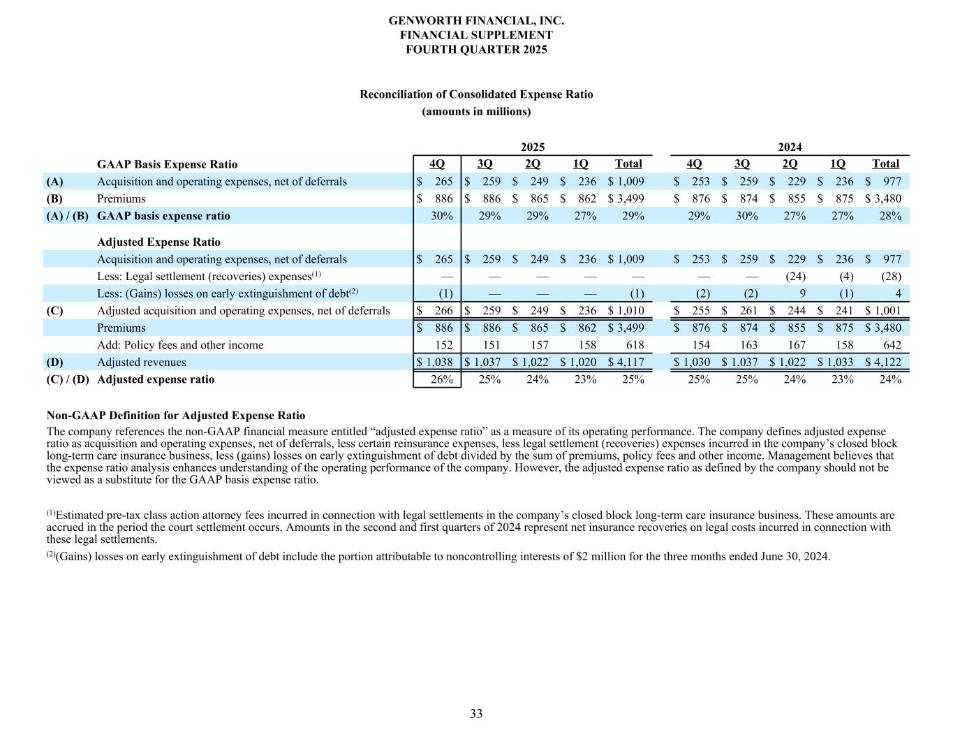 Reconciliation of Consolidated Expense Ratio (amounts in millions) 2025 2024 GAAP Basis Expense Ratio 4Q 3Q 2Q 1Q Total 4Q 3Q 2Q 1Q Total (A) Acquisition and operating expenses, net of deferrals $ 265 $ 259 $ 249 $ 236 $ 1,009 $ 253 $ 259 $ 229 $ 236 $ 977 (B) Premiums $ 886 $ 886 $ 865 $ 862 $ 3,499 $ 876 $ 874 $ 855 $ 875 $ 3,480 (A) / (B) GAAP basis expense ratio 30 % 29 % 29 % 27 % 29 % 29 % 30 % 27 % 27 % 28 % Adjusted Expense Ratio Acquisition and operating expenses, net of deferrals $ 265 $ 259 $ 249 $ 236 $ 1,009 $ 253 $ 259 $ 229 $ 236 $ 977 Less: Legal settlement (recoveries) expenses(1) — — — — — — — (24) (4) (28) Less: (Gains) losses on early extinguishment of debt(2) (1) — — — (1) (2) (2) 9 (1) 4 (C) Adjusted acquisition and operating expenses, net of deferrals $ 266 $ 259 $ 249 $ 236 $ 1,010 $ 255 $ 261 $ 244 $ 241 $ 1,001 Premiums $ 886 $ 886 $ 865 $ 862 $ 3,499 $ 876 $ 874 $ 855 $ 875 $ 3,480 Add: Policy fees and other income 152 151 157 158 618 154 163 167 158 642 (D) Adjusted revenues $ 1,038 $ 1,037 $ 1,022 $ 1,020 $ 4,117 $ 1,030 $ 1,037 $ 1,022 $ 1,033 $ 4,122 (C) / (D) Adjusted expense ratio 26 % 25 % 24 % 23 % 25 % 25 % 25 % 24 % 23 % 24 % Non-GAAP Definition for Adjusted Expense Ratio The company references the non-GAAP financial measure entitled “adjusted expense ratio” as a measure of its operating performance. The company defines adjusted expense ratio as acquisition and operating expenses, net of deferrals, less certain reinsurance expenses, less legal settlement (recoveries) expenses incurred in the company’s closed block long-term care insurance business, less (gains) losses on early extinguishment of debt divided by the sum of premiums, policy fees and other income. Management believes that the expense ratio analysis enhances understanding of the operating performance of the company. However, the adjusted expense ratio as defined by the company should not be viewed as a substitute for the GAAP basis expense ratio. (1)Estimated pre-tax class action attorney fees incurred in connection with legal settlements in the company’s closed block long-term care insurance business. These amounts are accrued in the period the court settlement occurs. Amounts in the second and first quarters of 2024 represent net insurance recoveries on legal costs incurred in connection with these legal settlements. (2)(Gains) losses on early extinguishment of debt include the portion attributable to noncontrolling interests of $2 million for the three months ended June 30, 2024. GENWORTH FINANCIAL, INC. FINANCIAL SUPPLEMENT FOURTH QUARTER 2025 33