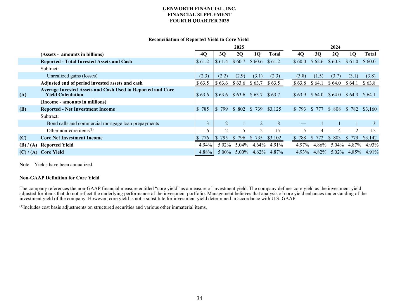 Reconciliation of Reported Yield to Core Yield 2025 2024 (Assets - amounts in billions) 4Q 3Q 2Q 1Q Total 4Q 3Q 2Q 1Q Total Reported - Total Invested Assets and Cash $ 61.2 $ 61.4 $ 60.7 $ 60.6 $ 61.2 $ 60.0 $ 62.6 $ 60.3 $ 61.0 $ 60.0 Subtract: Unrealized gains (losses) (2.3) (2.2) (2.9) (3.1) (2.3) (3.8) (1.5) (3.7) (3.1) (3.8) Adjusted end of period invested assets and cash $ 63.5 $ 63.6 $ 63.6 $ 63.7 $ 63.5 $ 63.8 $ 64.1 $ 64.0 $ 64.1 $ 63.8 (A) Average Invested Assets and Cash Used in Reported and Core Yield Calculation $ 63.6 $ 63.6 $ 63.6 $ 63.7 $ 63.7 $ 63.9 $ 64.0 $ 64.0 $ 64.3 $ 64.1 (Income - amounts in millions) (B) Reported - Net Investment Income $ 785 $ 799 $ 802 $ 739 $ 3,125 $ 793 $ 777 $ 808 $ 782 $ 3,160 Subtract: Bond calls and commercial mortgage loan prepayments 3 2 1 2 8 — 1 1 1 3 Other non-core items(1) 6 2 5 2 15 5 4 4 2 15 (C) Core Net Investment Income $ 776 $ 795 $ 796 $ 735 $ 3,102 $ 788 $ 772 $ 803 $ 779 $ 3,142 (B) / (A) Reported Yield 4.94 % 5.02 % 5.04 % 4.64 % 4.91 % 4.97 % 4.86 % 5.04 % 4.87 % 4.93 % (C) / (A) Core Yield 4.88 % 5.00 % 5.00 % 4.62 % 4.87 % 4.93 % 4.82 % 5.02 % 4.85 % 4.91 % Note: Yields have been annualized. Non-GAAP Definition for Core Yield The company references the non-GAAP financial measure entitled “core yield” as a measure of investment yield. The company defines core yield as the investment yield adjusted for items that do not reflect the underlying performance of the investment portfolio. Management believes that analysis of core yield enhances understanding of the investment yield of the company. However, core yield is not a substitute for investment yield determined in accordance with U.S. GAAP. (1)Includes cost basis adjustments on structured securities and various other immaterial items. GENWORTH FINANCIAL, INC. FINANCIAL SUPPLEMENT FOURTH QUARTER 2025 34